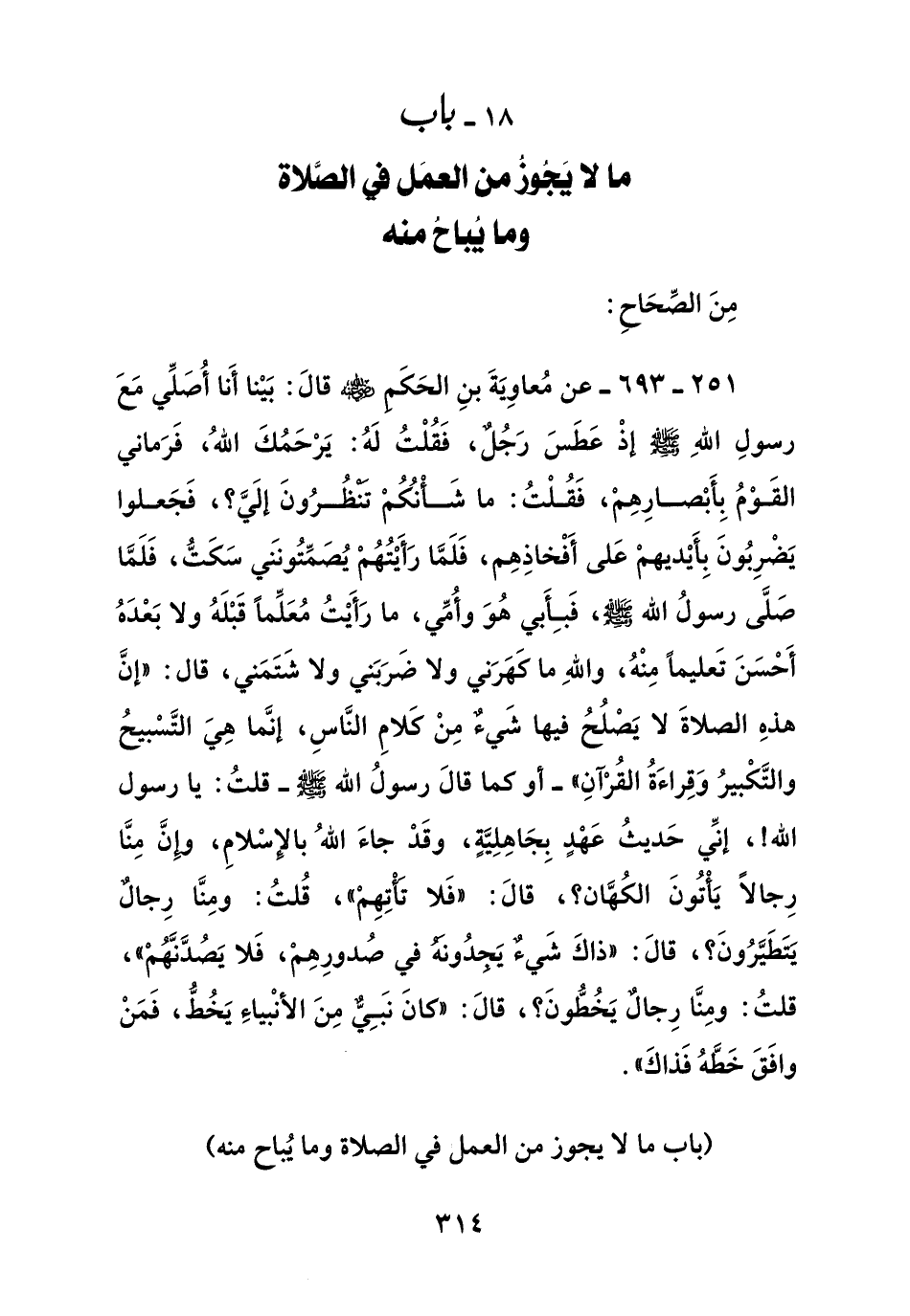 251 - 693 - عن معاوية بن الحكم رضي الله عنه قال: بينا أنا أصلي مع رسول الله صلى الله عليه وسلم إذ عطس رجل , فقلت له: يرحمك الله , فرماني القوم بأبصارهم , فقلت: ما شأنكم تنظرون إلى؟ فجعلوا يضربون بأيديهم على أفخاذهم , فلما رأيتهم يصمتونني سكت , فلما صلى رسول الله صلى الله عليه وسلم , فبأبي هو وأمي , ما رأيت معلما قبله ولا بعده أحسن تعليما منه , والله ما كهرني ولا ضربني ولا شتمني , قال: " إن هذه الصلاة لا يصلح فيها شيء من كلام الناس , إنما هي التسبيح والتكبير وقراءة القرآن "- أو كما قال رسول الله صلى الله عليه وسلم - قلت: يا رسول الله! إني حديث عهد بجاهلية , وقد جاء الله بالإسلام , وإن منا رجالا يأتون الكهان؟ , قال: " فلا تأتهم " , قلت: ومنا رجال يتطيرون؟ , قال: " ذاك شيء يجدونه في صدورهم , فلا يصدنهم ", قلت: ومنا رجال يخطون؟ , قال: " كان نبي من الأنبياء يخط , فمن وافق خطه فذاك ".