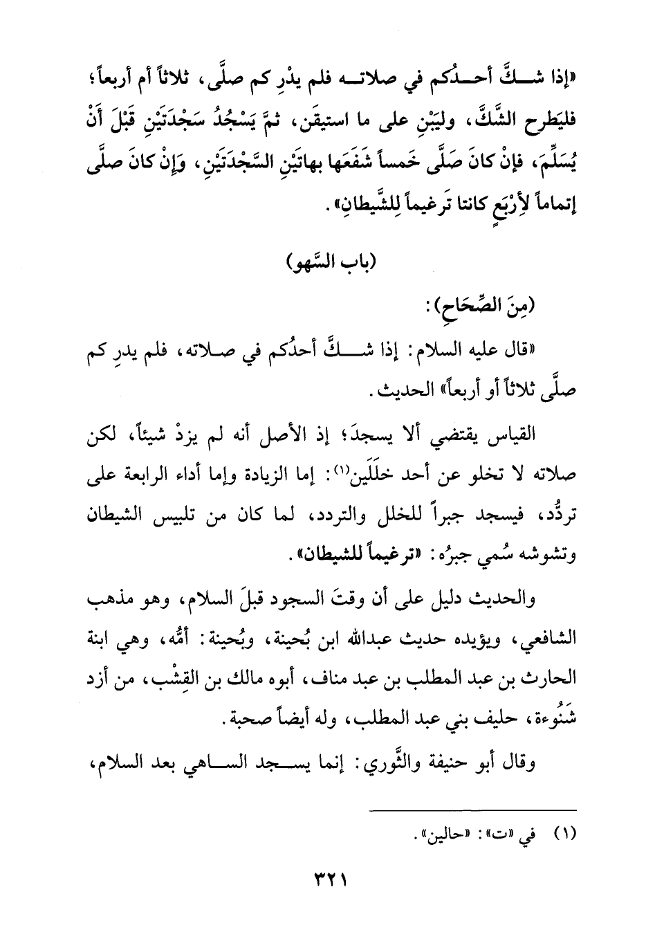 " قال عليه السلام: إذا شك أحدكم في صلاته , فلم يدر كم صلى ثلاثا أو أربعا " الحديث.
