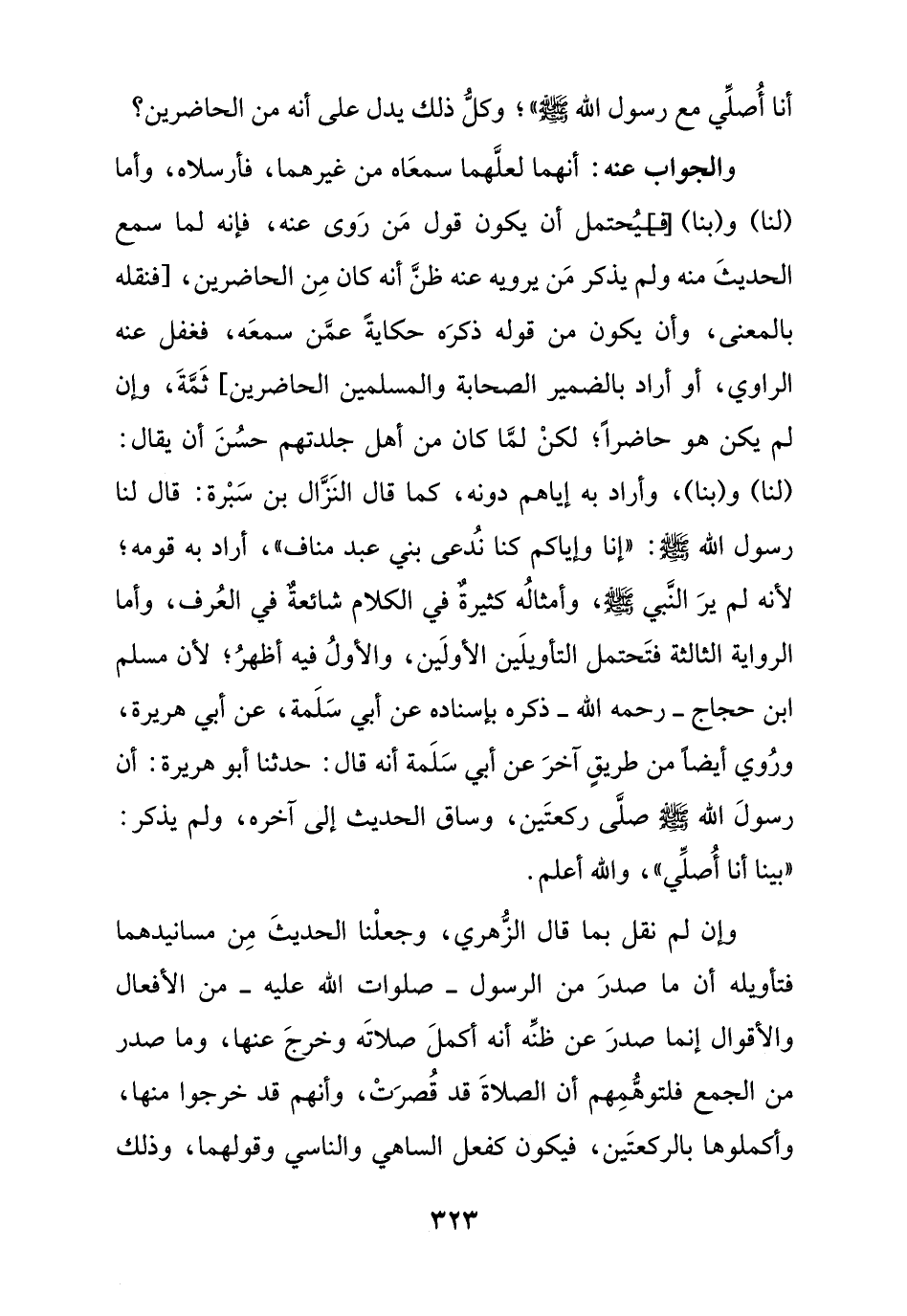 وإن لم نقل بما قال الزهري , وجعلنا الحديث من مسانيدهما فتأويله أن ما صدر من الرسول - صلوات الله عليه - من الأفعال والأقوال إنما صدر عن ظنه أنه أكمل صلاته وخرج عنها , وما صدر من الجمع فلتوهمهم أن الصلاة قد قصرت , وأنهم قد خرجوا منها , وأكملوها بالركعتين , فيكون كفعل الساهي والناسي وقولهما , وذلك