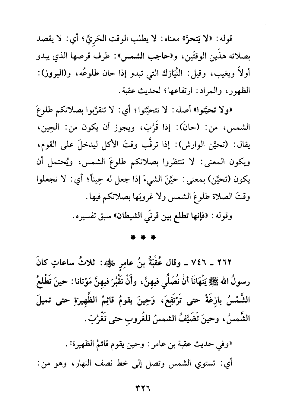 262 - 746 - وقال عقبة بن عامر رضي الله عنه: ثلاث ساعات كان رسول الله صلى الله عليه وسلم ينهانا أن نصلي فيهن , وأن نقبر فيهن موتانا: حين تطلع الشمس بازغة حتى ترتفع , وحين يقوم قائم الظهيرة حتى تميل الشمس , وحين تضيف الشمس للغروب حتى تغرب.