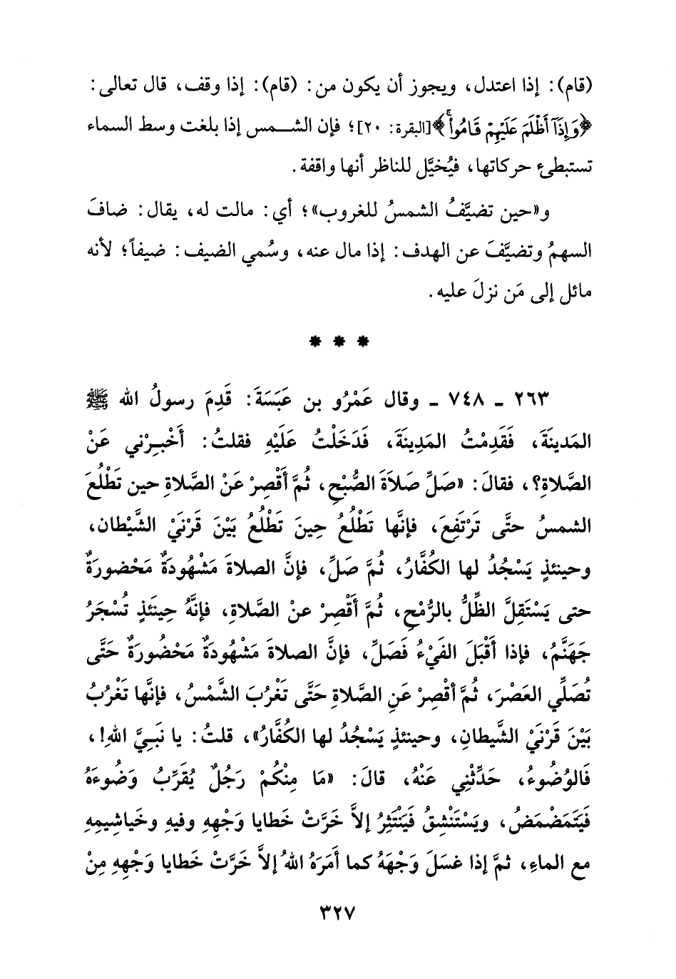 263 - 748 - وقال عمرو بن عبسة: قدم رسول الله صلى الله عليه وسلم المدينة , فقدمت المدينة , فدخلت عليه فقلت: أخبرني عن الصلاة؟ , فقال: " صل صلاة الصبح , ثم أقصر عن الصلاة حين تطلع الشمس حتى ترتفع , فإنها تطلع حين تطلع بين قرني الشيطان , وحينئذ يسجد لها الكفار , ثم صل , فإن الصلاة مشهودة محضورة حتى يستقل الظل بالرمح , ثم أقصر عن الصلاة , فإنه حينئذ تسجر جهنم , فإذا أقبل الفيء فصل , فإن الصلاة مشهودة محضورة حتى تصلي العصر , ثم أقصر عن الصلاة حتى تغرب الشمس , فإنها تغرب بين قرني الشيطان , وحينئذ يسجد لها الكفار " قلت: يا نبي الله! فالوضوء , حدثني عنه وقال:" ما منكم رجل يقرب وضوءه فيتمضمض , ويستنشق فينتثر إلا خرت خطايا وجهه وفيه وخياشيمه مع الماء , ثم إذا غسل وجهه كما أمره الله إلا خرت خطايا وجهه من