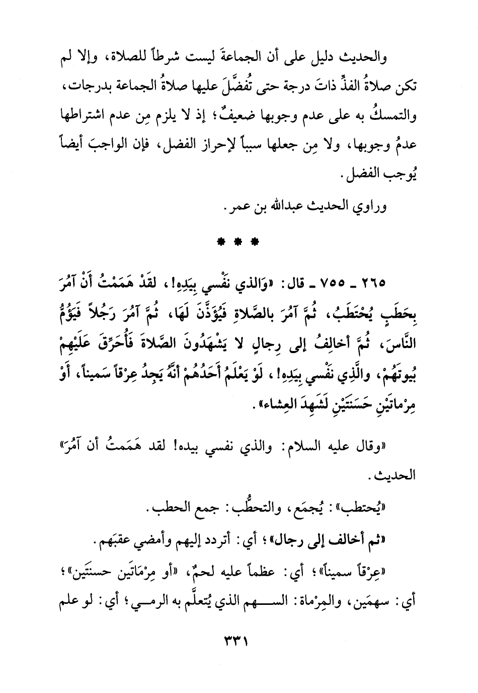 265 - 755 - قال: " والذي نفسي بيده! لقد هممت أن أمر بحطب يحتطب , ثم آمر بالصلاة فيؤذن لها , ثم آمر رجلا فيؤم الناس , ثم أخالف إلى رجال لا يشهدون الصلاة فأحرق عليهم بيوتهم , والذي نفسي بيده! لو يعلم أحدهم أنه يجد عرفا سمينا , أو مرماتين حسنتين لشهد العشاء ".