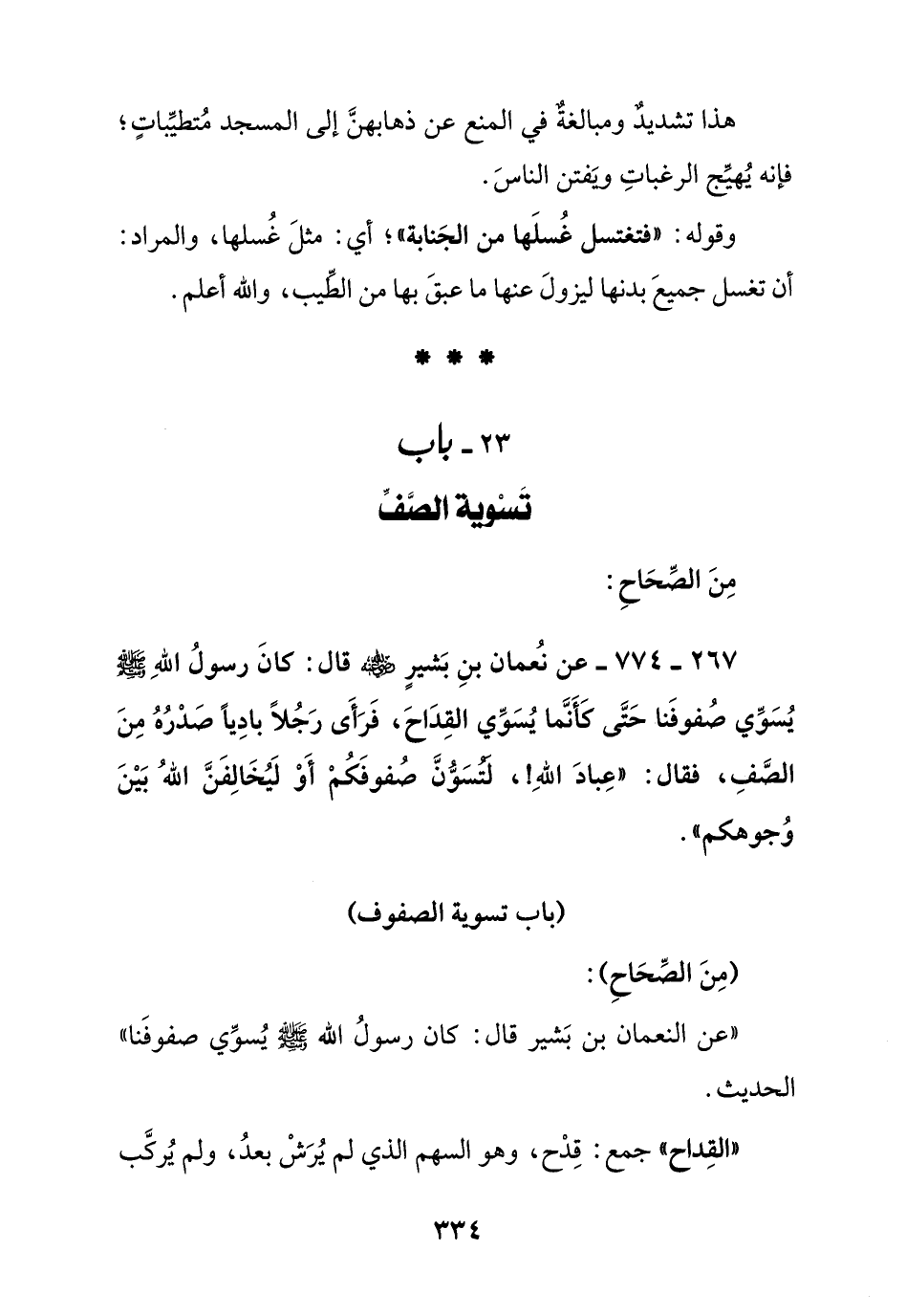 267 - 774 - عن نعمان بن بشير رضي الله عنه قال: كان رسول الله صلى الله عليه وسلم يسوي صفوفنا حتى كأنما يسوي القداح , فرأى رجلا باديا صدره من الصف , فقال: " عباد الله! لتسون صفوفكم أو ليخالفن الله بين وجوهكم ".