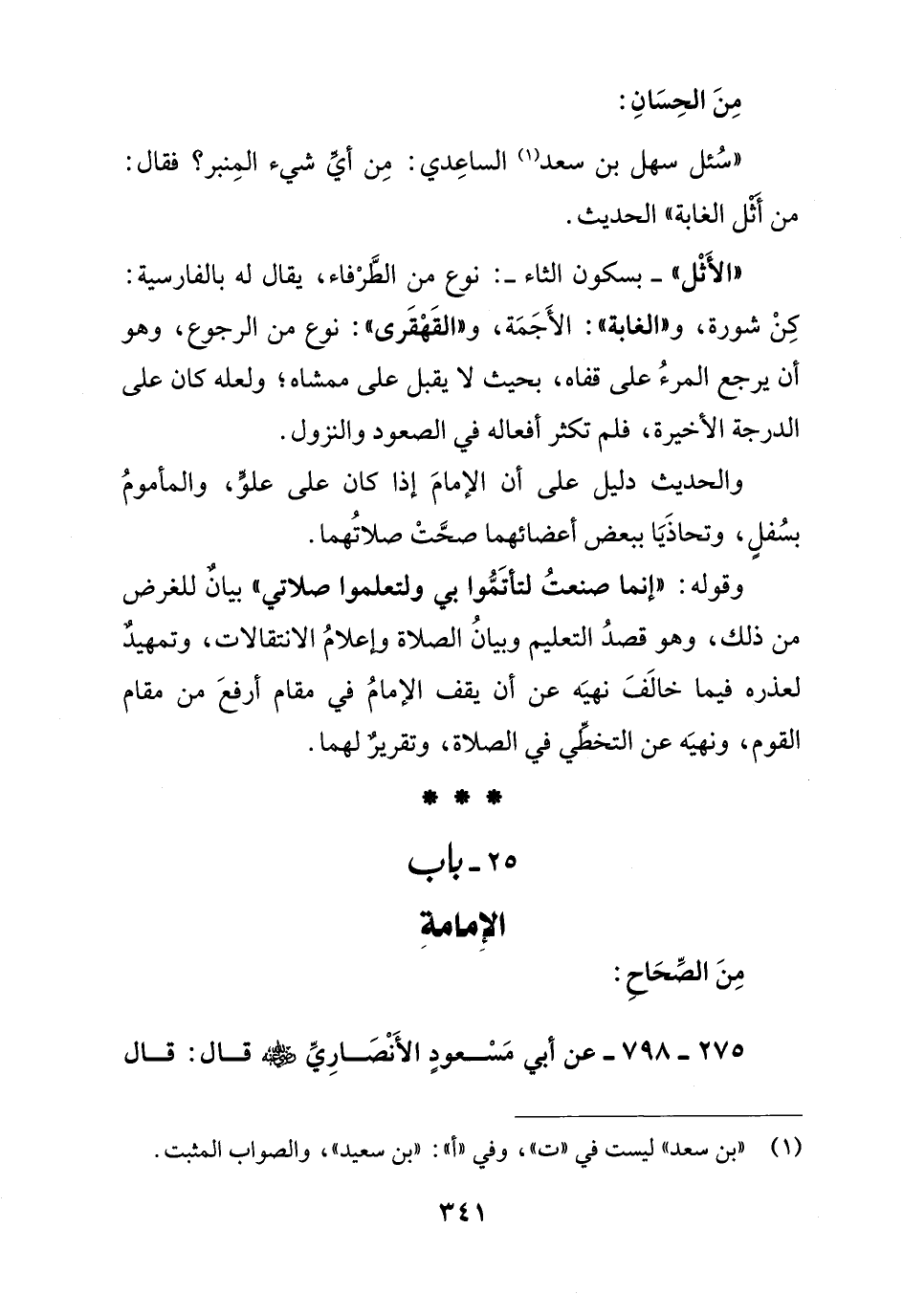 "سئل سهل بن سعد الساعدي: من أي شيء المنبر؟ فقال: من أثل الغابة " الحديث.