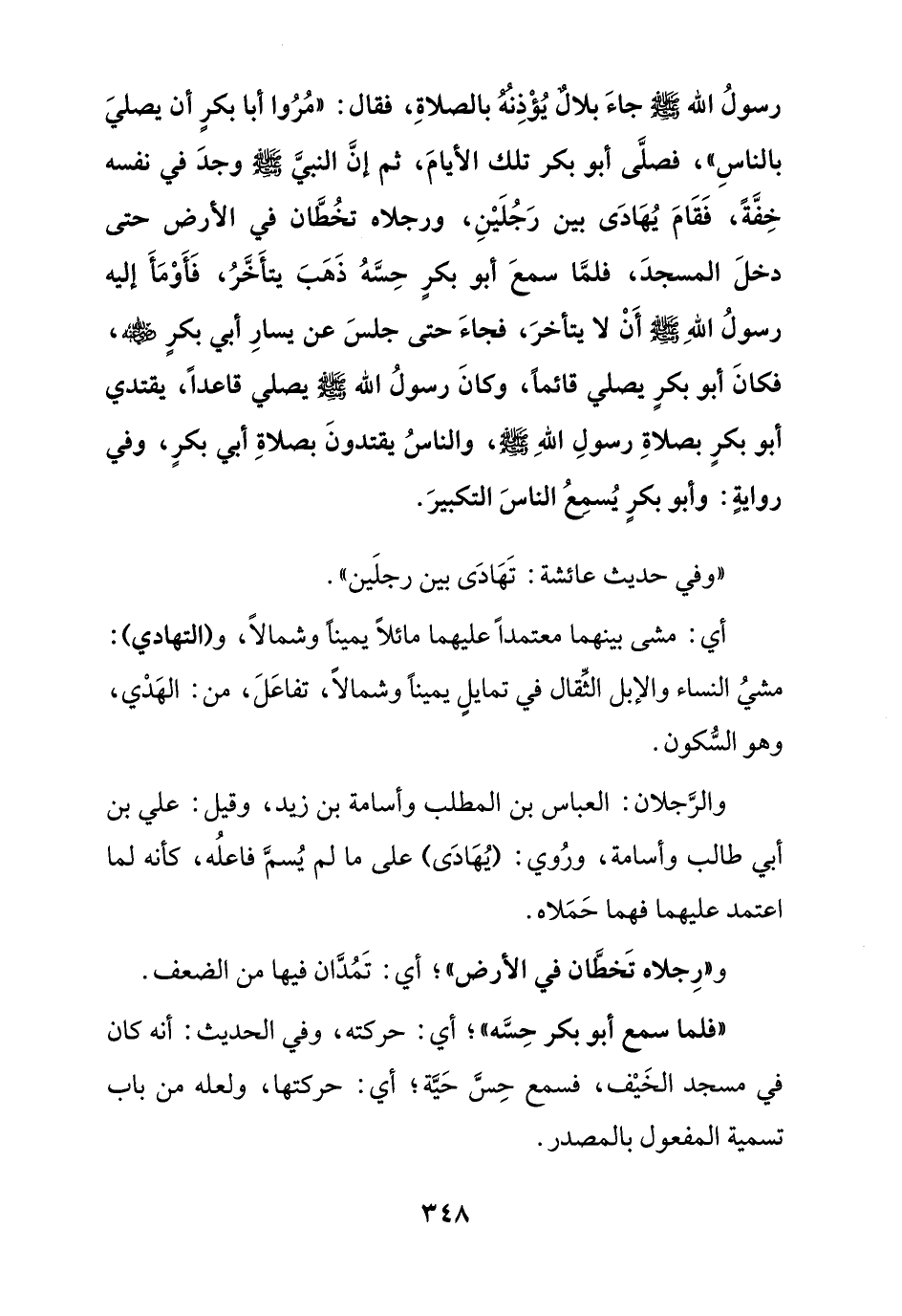 رسول الله صلى الله عليه وسلم جاء بلال يؤذنه بالصلاة , فقال: " مروا أبا بكر أن يصلي بالناس " , فصلى أبو بكر تلك الأيام , ثم إن النبي صلى الله عليه وسلم وجد في نفسه خفة , فقام يهادى بين رجلين , ورجلاه تخطان في الأرض حتى دخل المسجد , فلما سمع أبو بكر حسه ذهب يتأخر , فأومأ إليه رسول الله صلى الله عليه وسلم أن لا يتأخر , فجاء حتى جلس عن يسار أبي بكر رضي الله عنه , فكأن أبو بكر يصلي قائما , وكان رسول الله صلى الله عليه وسلم يصلي قاعدا , يقتدي أبو بكر بصلاة رسول الله صلى الله عليه وسلم , والناس يقتدون بصلاة أبي بكر , وفي رواية: وأبو بكر يسمع الناس التكبير.