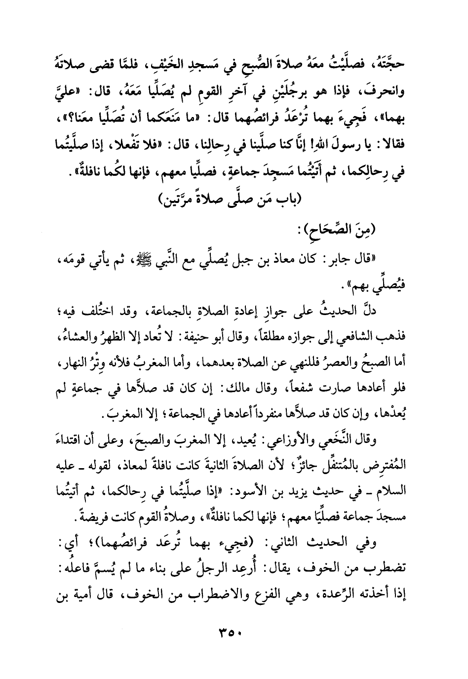 حجته , فصليت معه صلاة الصبح في مسجد الخيف ,فلما قضى صلاته وانحرف , فإذا هو برجلين في آخر القوم لم يصليا معه , قال: " علي بهما " فجيء بهما ترعد فرائصهما قال: " ما منعكما أن تصليا معنا؟ ", فقالا: يا رسول الل! إنا كنا صلينا في رحالنا , قال:" فلا تفعلا , إذا صليتما في رحالكما , ثم أتيتما مسجد , فصليا معهم , فإنهما لكما نافلة ".