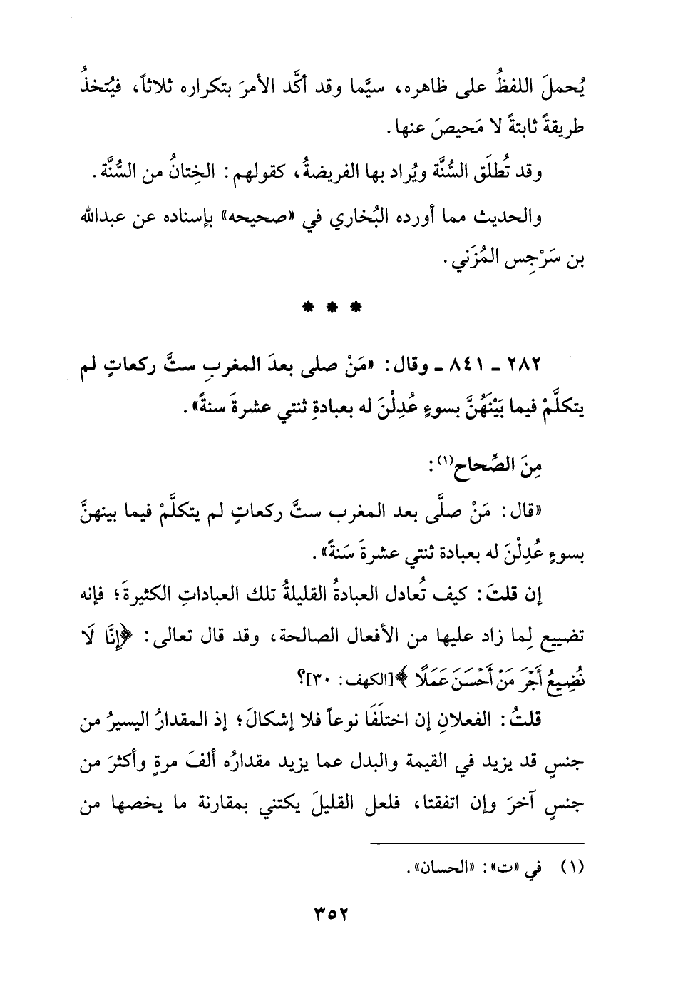 282 - 841 - وقال: " من صلى بعد المغرب ست ركعات لم يتكلم فيما بينهن بسوء عدلن له بعبادة ثنتي عشرة سنة ".