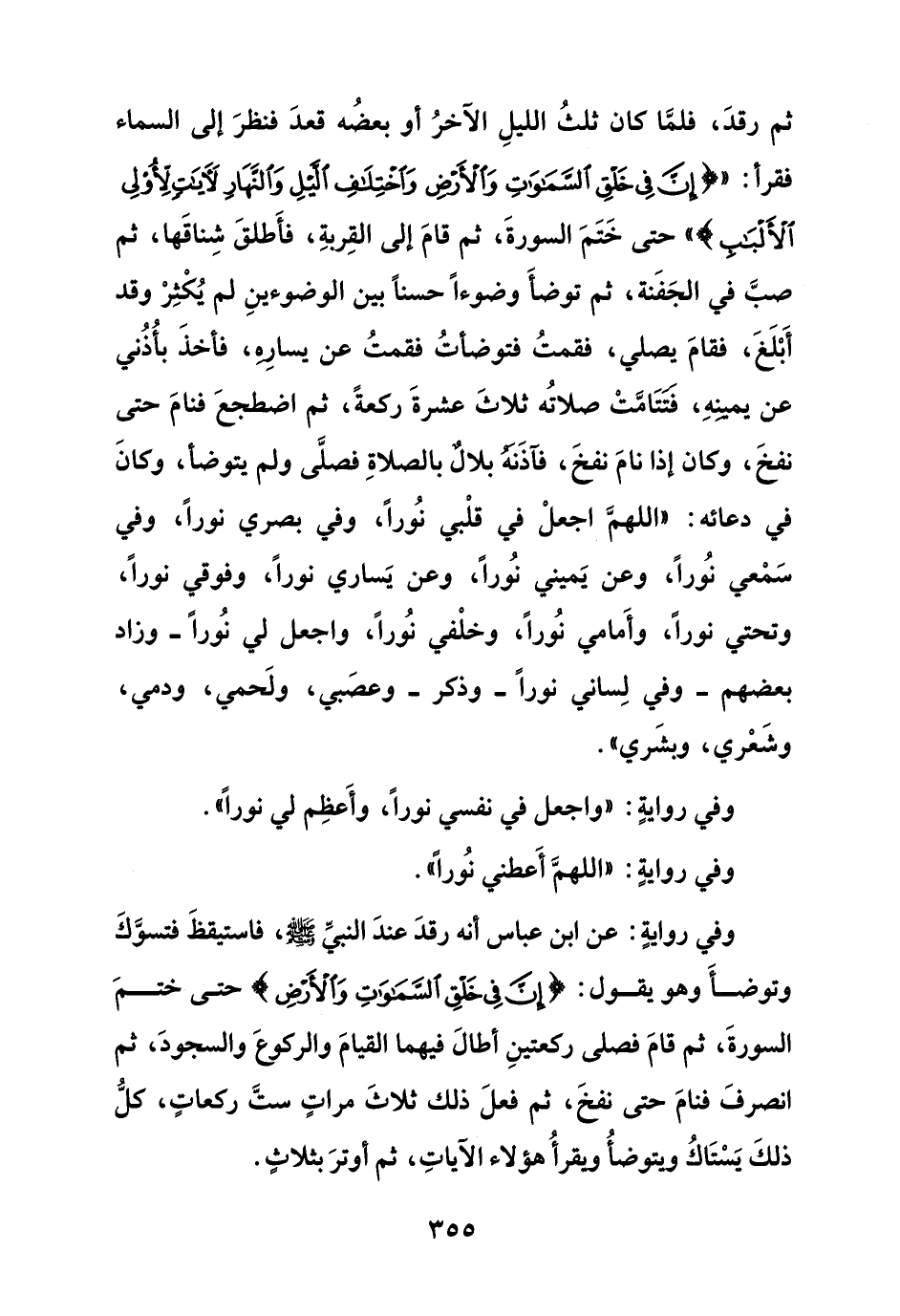 ثم رقد , فلما كان ثلث الليل الآخر أو بعضه قعد فنظر إلى السماء فقرأ: {إن في خلق السموات والأرض واختلف الليل والنهار لآيات لأولي الألباب} حتى ختم السورة , ثم قام إلى القربة , فأطلق شناقها , ثم صب في الجفنة , ثم توضأ وضوءا حسنا بين الوضوءين لم يكثر وقد أبلغ , فقام يصلي , فقمت فنوضأت فقمت عن يساره , فأخذ بأذني عن يمينه , فتنامت صلاته ثلاث عشرة ركعة , ثم اضطجع فنام حتى نفخ , وكان إذا نام نفخ , فآذنه بلال بالصلاة فصلى ولم يتوضأ , وكان في دعائه: " اللهم اجعل في قلبي نورا , وفي بصري نورا , وفي سمعي نورا , وعن يميني نورا , وعن يساري نورا , وفوقي نورا , وتحتي نورا , وأمامي نورا , وخلفي نورا , واجعل لي نورا , - وزاد بعضهم - وفي لساني نورا , - وذكر - وعصبي , ولحمي , ودمي , وشعري , وبشري ".