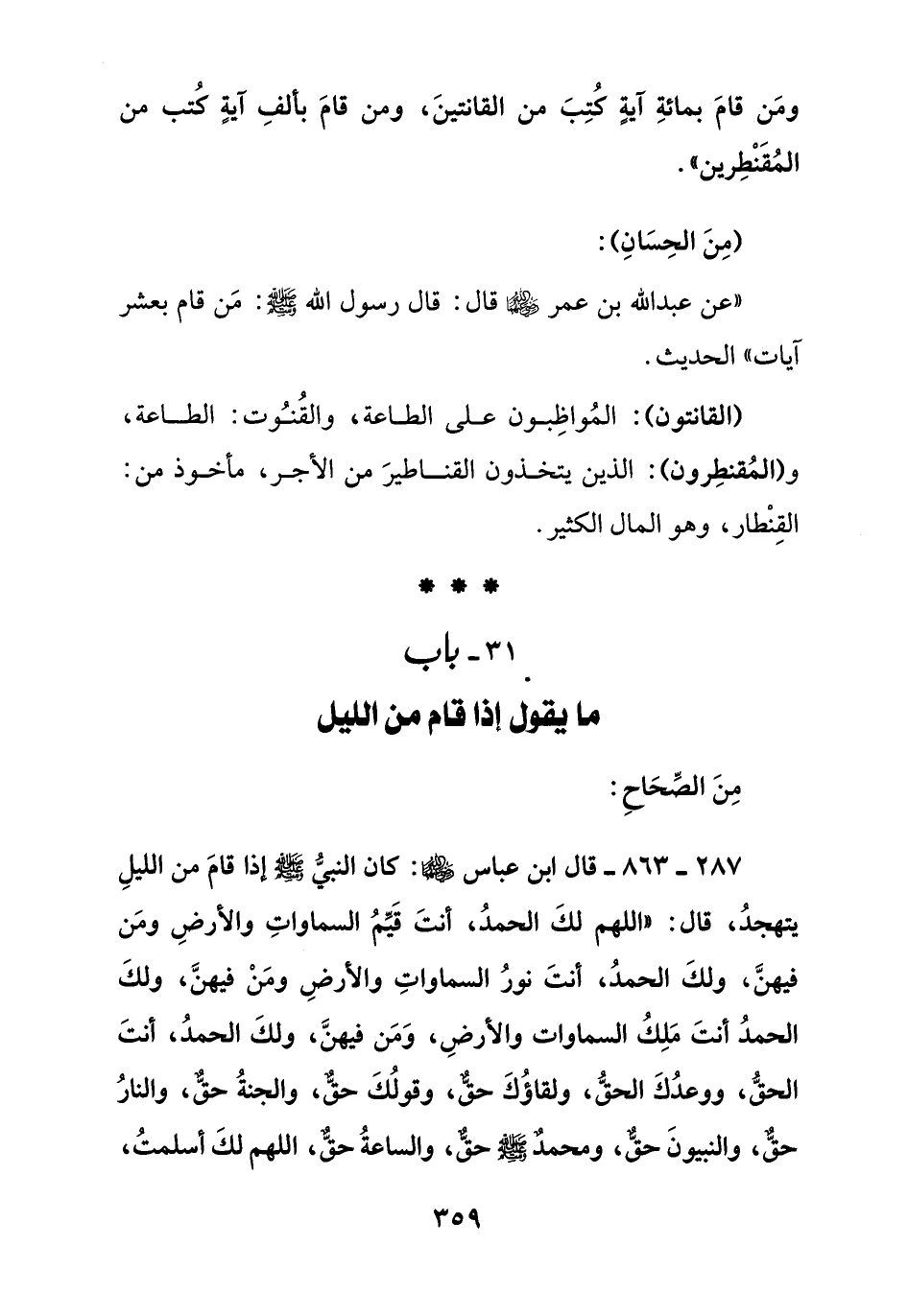 287 - 863 - قال ابن عباس رضي الله عنهما: كان النبي صلى الله عليه وسلم إذا قام الليل يتهجد , قال: " اللهم لك الحمد , أنت قيم السماوات والأرض ومن فيهن , ولك الحمد , أنت نور السماوات والأرض ومن فيهن , ولك الحمد أنت ملك السماوات والأرض , ومن فيهن , ولك الحمد , أنت الحق , ووعدك الحق , ولقاؤك حق , وقولك حق , والجنة حق , والنار حق , والنبيون حق , ومحمد صلى الله عليه وسلم حق , والساعة حق , اللهم لك أسلمت ,