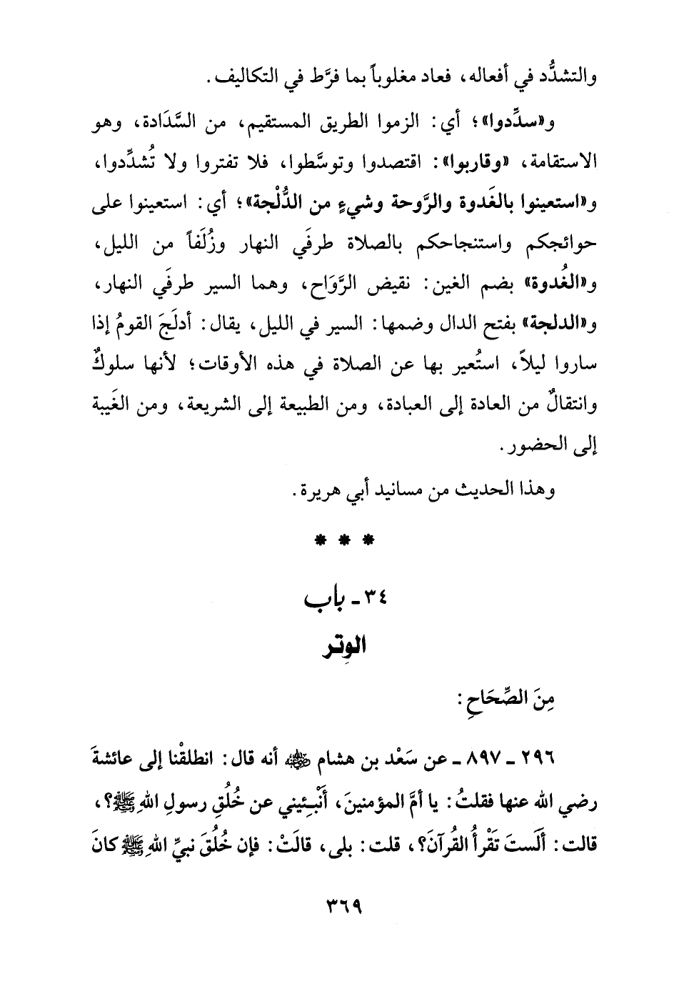296 - 897 - عن سعد بن هشام رضي الله عنه أنه قال: انطلقنا إلى عائشة رضي الله عنها فقلت: يا أم المؤمنين , أنبئيني عن خلق رسول الله صلى الله عليه وسلم؟ , قالت: ألست تقرأ القرآن؟ , قلت: بلى , قالت: فإن خلق نبي الله صلى الله عليه وسلم كان
