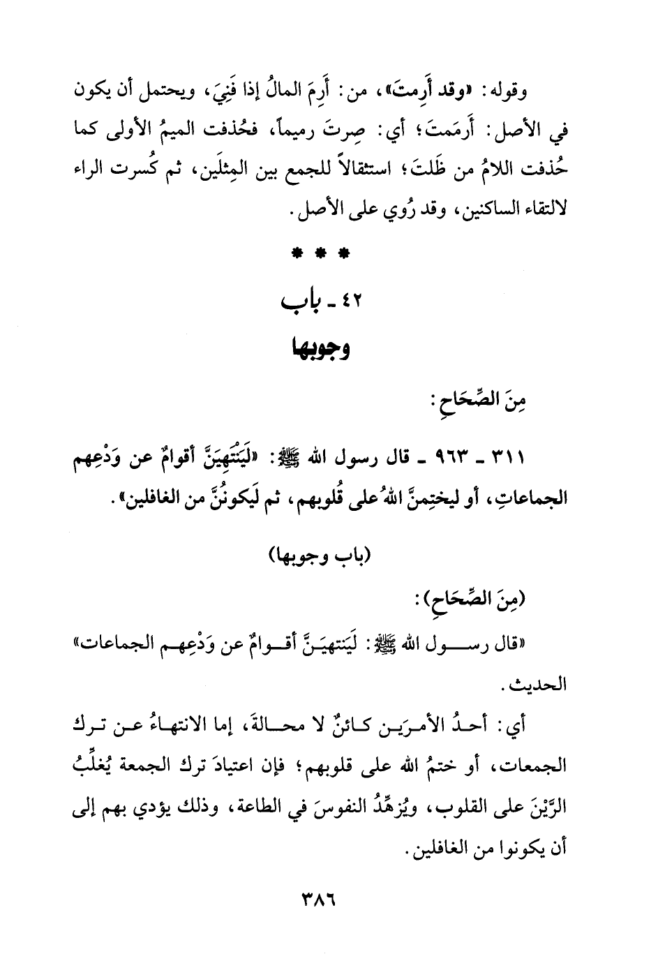 311 - 963 - قال رسول الله صلى الله عليه وسلم: " لينتهين أقوام عن ودعهم الجماعات , أو ليختمن الله على قلوبهم , ثم ليكونن من الغافلين ".