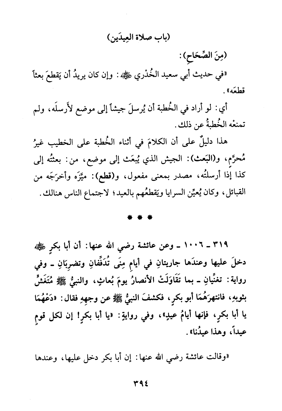 319 - 1006 - وعن عائشة رضي الله عنها: أن أبا بكر رضي الله عنه دخل عليها وعندها جاريتان في أيام منى تدفقان وتضربان - وفي رواية: تغنيان - بما تقاولت الأنصار يوم بعاث , والنبي صلى الله عليه وسلم متغش بثوبه , فانتهرهما أبو بكر , فكشف النبي صلى الله عليه وسلم عن وجهه فقال: " دعهما يا أبا بكر , فإنها أيام عيد , وفي رواية: " يا أبا بكر! إن لكل قوم عيدا , وهذا عيدنا ".