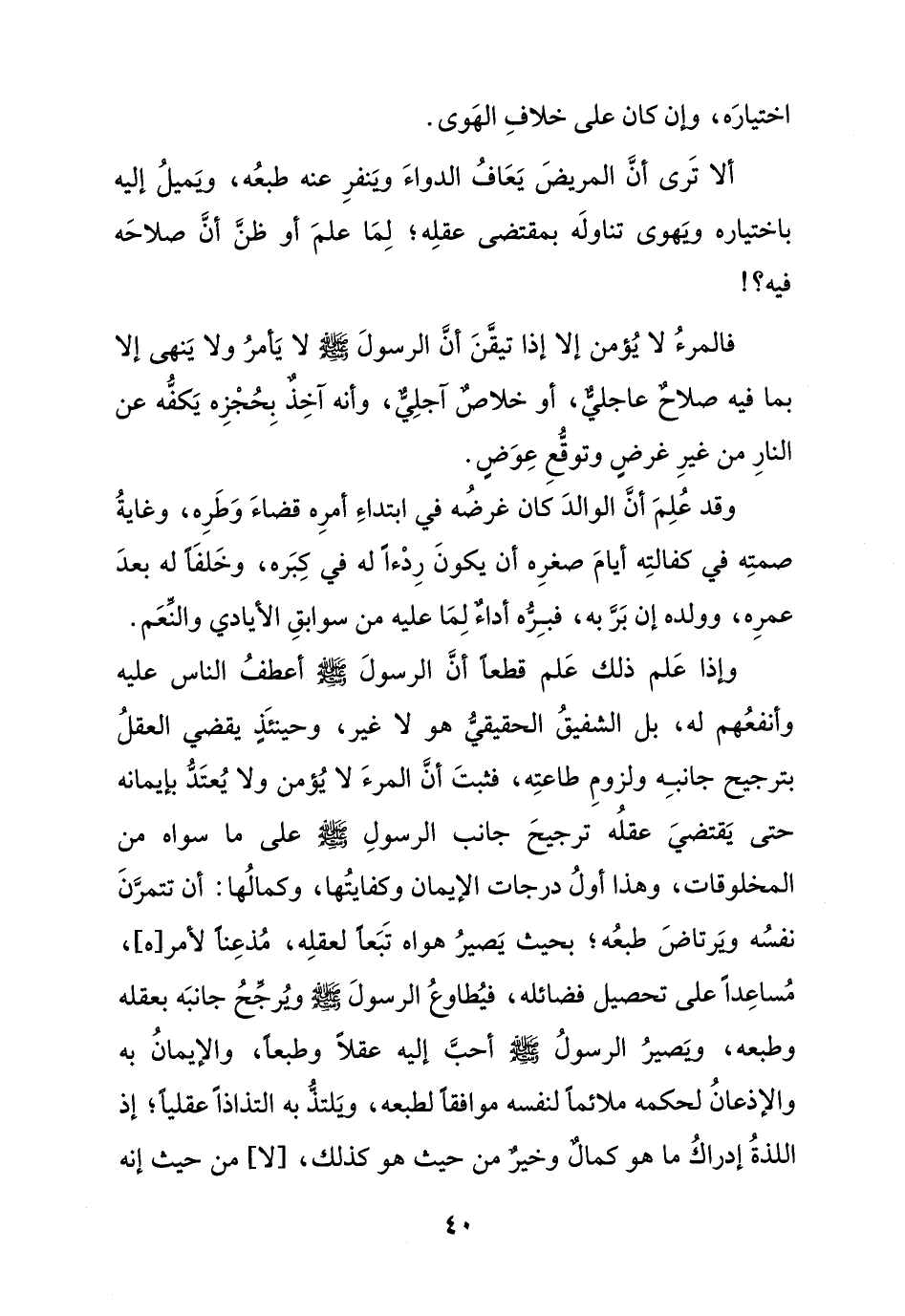 ويرجح جانبه بعقله وطبعه, ويصير الرسول - صلى الله عليه وسلم - أحب إليه عقلا وطبعا,