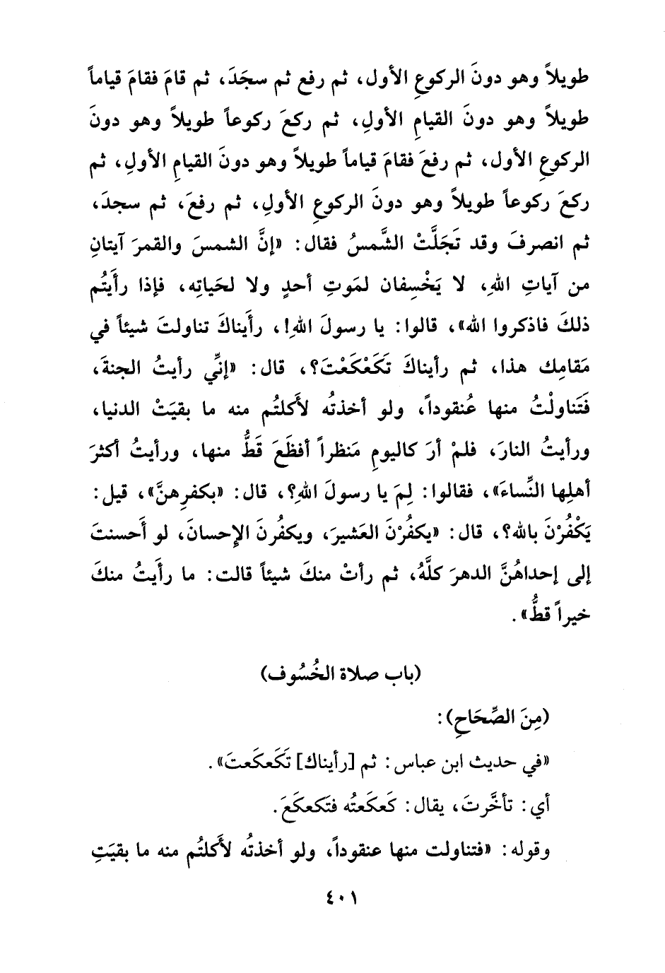 طويلا وهو دون الركوع الأول , ثم رفع ثم سجد , ثم قام فقام قياما طويلا وهو دون القيام الأول , ثم ركع ركوعا طويلا وهو دون الركوع الأول , ثم رفع فقام قياما طويلا وهو دون القيام الأول , ثم ركع ركوعا طويلا وهو دون الركوع الأول , ثم رفع , ثم سجد , ثم انصرف وقد تجلت الشمس فقال: " إن الشمس والقمر آيتان من آيات الله , لا يخسفان لموت أحد ولا لحياته , فإذا رأيتم ذلك فاذكروا الله " قالوا: يا رسول الله! رأيناك تناولت شيئا في مقامك هذا , ثم رأيناك تكعكعت؟ , قال: " إني رأيت الجنة , فتناولت منها عنقودا , ولو أخذته لأكلتم منه ما بقيت الدنيا , ورأيت النار , فلم أر كاليوم منظرا أفظع قط منها , ورأيت أكثر أهلها النساء " فقالوا: لم يا رسول الله؟ , قال: " بكفرهن " , قيل: يكفرن بالله؟ , قال: " يكفرن العشير , ويكفرن الإحسان , لو أحسنت إلى إحداهن الدهر كله , ثم رأت منك شيئا قالت: ما رأيت منك خيرا قط ".