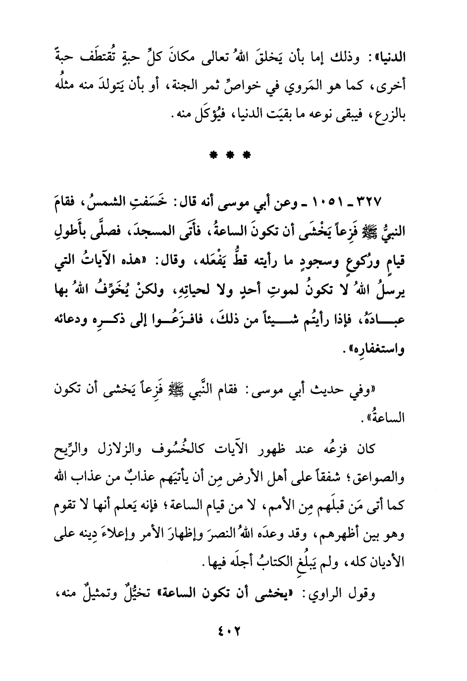 327 - 1051 - وعن أبي موسى أنه قال: خسفت الشمس , فقام النبي صلى الله عليه وسلم فزعا يخشى أن تكون الساعة , فأتى المسجد , فصلى بأطول قيام وركوع وسجود ما رأيته قط يفعله , وقال: " هذه الآيات التي يرسل الله لا تكون لموت أحد ولا لحياته , ولكن يخوف الله بها عبادة , فإذا رأيتم شيئا من ذلك , فافزعوا إلى ذكره ودعائه واستغفاره ".