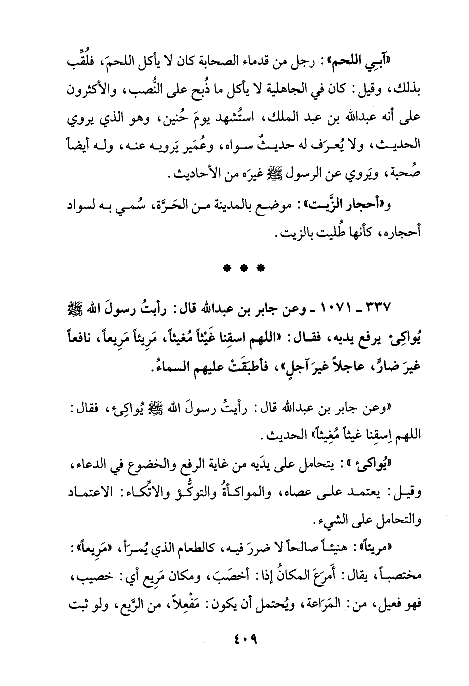 337 - 1071 - وعن جابر بن عبد الله قال: رأيت رسول الله صلى الله عليه وسلم يواكيء يرفع يديه , فقال: " اللهم اسقنا غيثا مغيثا , مريئا مريعا , نافعا غير ضار , عاجلا غير آجل ",