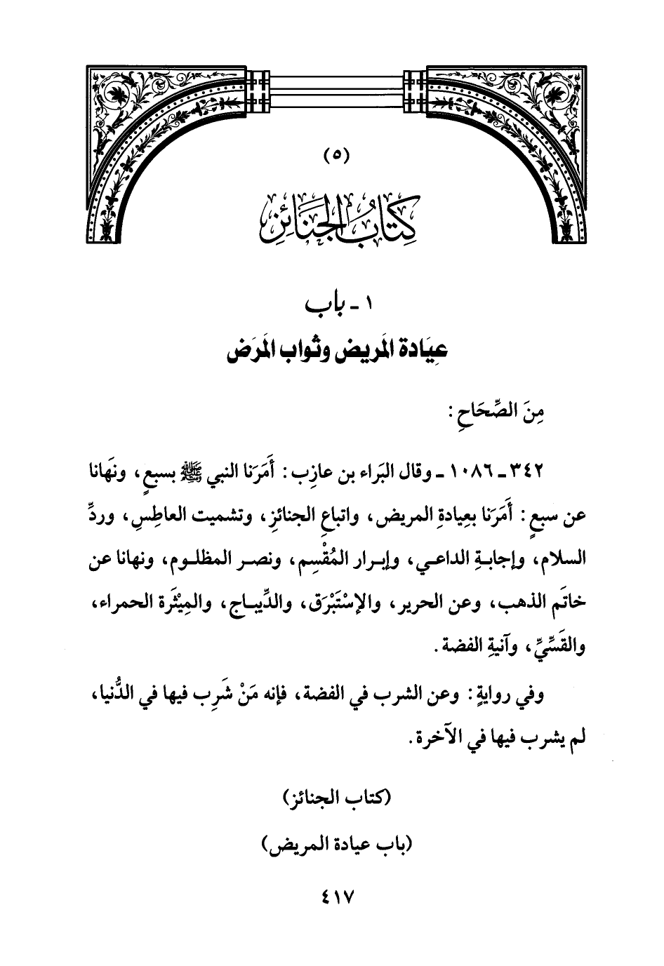 342 - 1086 - وقال البراء بن عازب: أمرنا النبي صلى الله عليه وسلم بسبع , ونهانا عن سبع: أمرنا بعيادة المريض , واتباع الجنائز , وتشميت العاطس , ورد السلام , وإجابة الداعي , وإبرار المقسم , ونصر المظلوم , ونهانا عن خاتم الذهب , وعن حرير , والإستبرق , والديباج , والميثرة الحمراء , والقسي , وآنية الفضة.