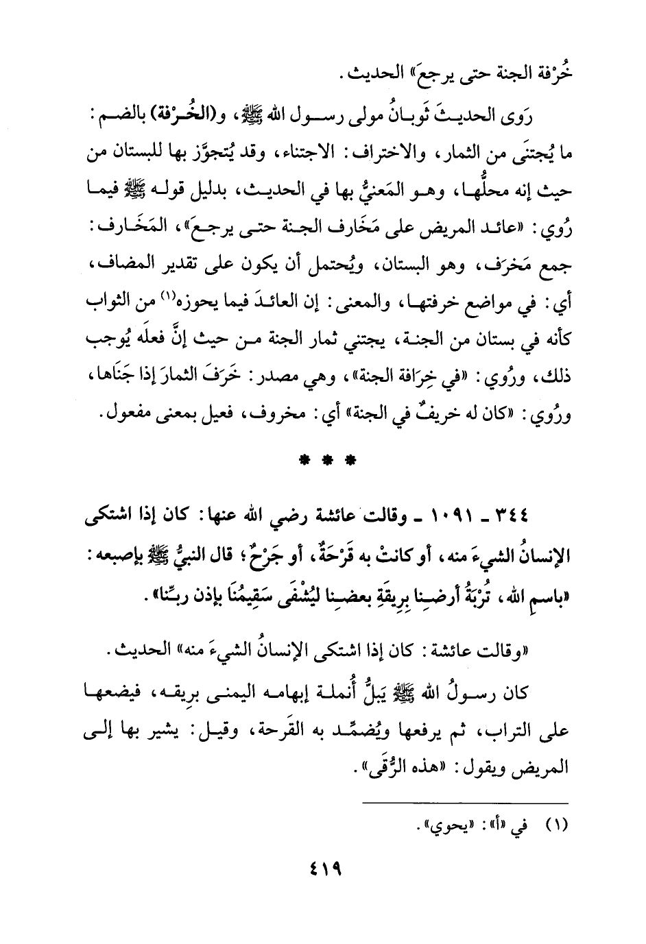 344 - 1091 - وقالت عائشة رضي الله عنها: كان إذا اشتكى الإنسان الشيء منه , أو كانت به قرحة , أو جرح , قال النبي صلى الله عليه وسلم بإصبعه: " باسم الله , تربة أرضنا بريقة بعضنا ليشفى سقيمنا بإذن ربنا ".