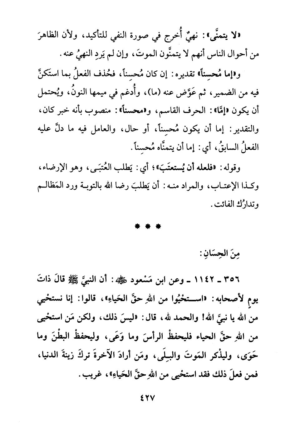 356 - 1142 - وعن ابن مسعود رضي الله عنه: أن النبي صلى الله عليه وسلم قال ذات يوم لأصحابه: " استحيوا من الله حق الحياء ", قالوا: إنا نستحيي من الله يا نبي الله! والحمد لله , قال: " ليس ذلك , ولكن من استحيى من الله حق الحياء فليحفظ الرأس وما وعى , وليحفظ البطن وما حوى , وليذكر الموت والبلى , ومن أراد الآخرة ترك زينة الدنيا , فمن فعل ذلك فقد استحيى من الله حق الحياء ", غريب.