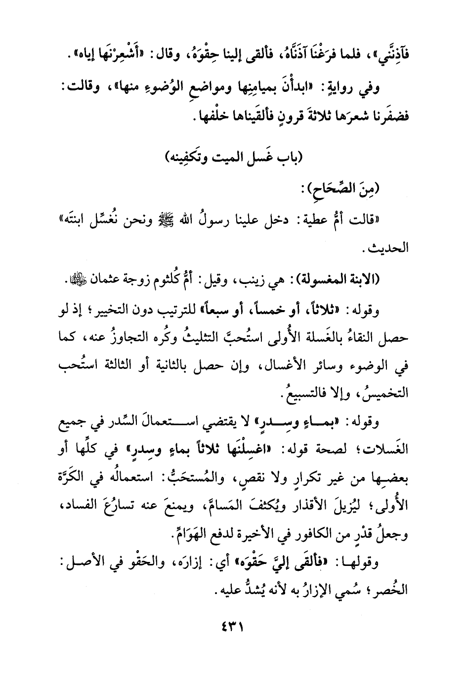 وفي رواية: " ابدأن بميامنها ومواضع الوضوء منها " , وقالت: فضفرنا شعرنا ثلاثة قرون فألقيناها خلفها.