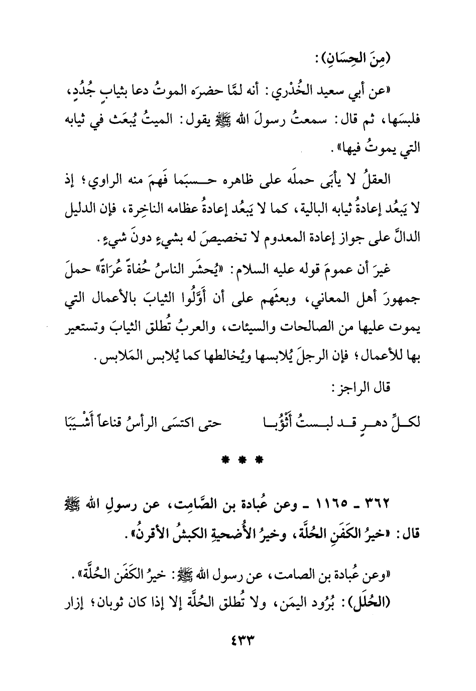 362 - 1165 - وعن عبادة بن الصامت , عن رسول الله صلى الله عليه وسلم قال: " خير الكفن الحلة , وخير الأضحية الكبش الأقرن ".