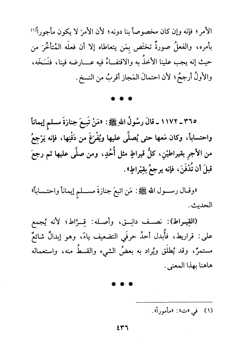 365 - 1172 - قال رسول الله صلى الله عليه وسلم: " من تبع جنازة مسلم إيمانا واحتسابا , وكان معها حتى يصلى عليها ويفرغ من دفنها , فإنه يرجع من الأجر بقيراطين , كل قيراط مثل أحد , ومن صلى عليها ثم رجع قبل أن تدفن , فإنه يرجع بقيراط ".
