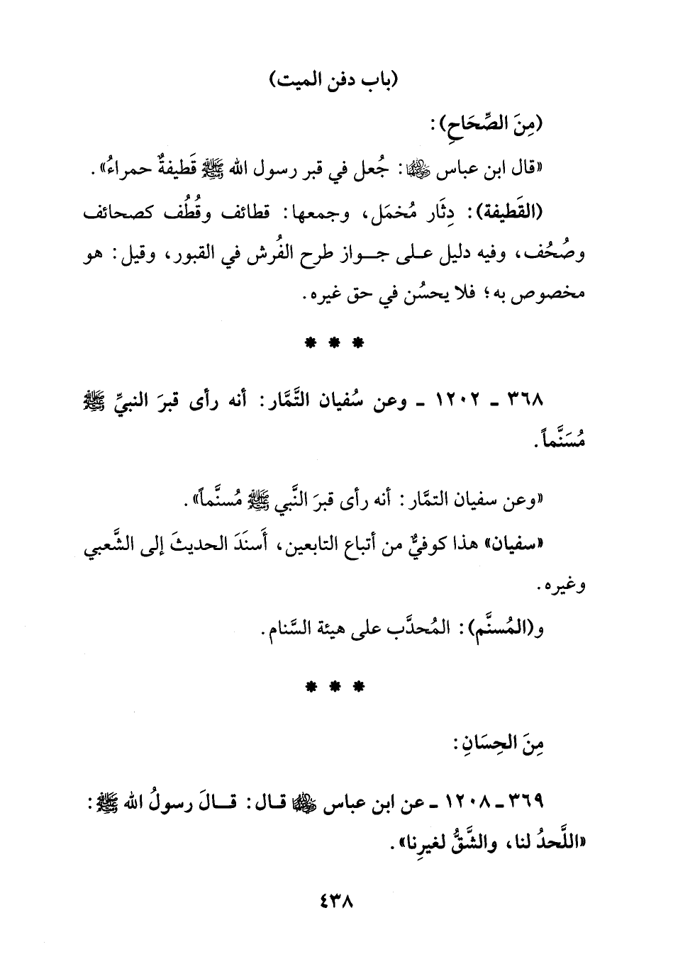 368 - 1202 - وعن سفيان التمار: أنه رأى قبر النبي صلى الله عليه وسلم مسنما.