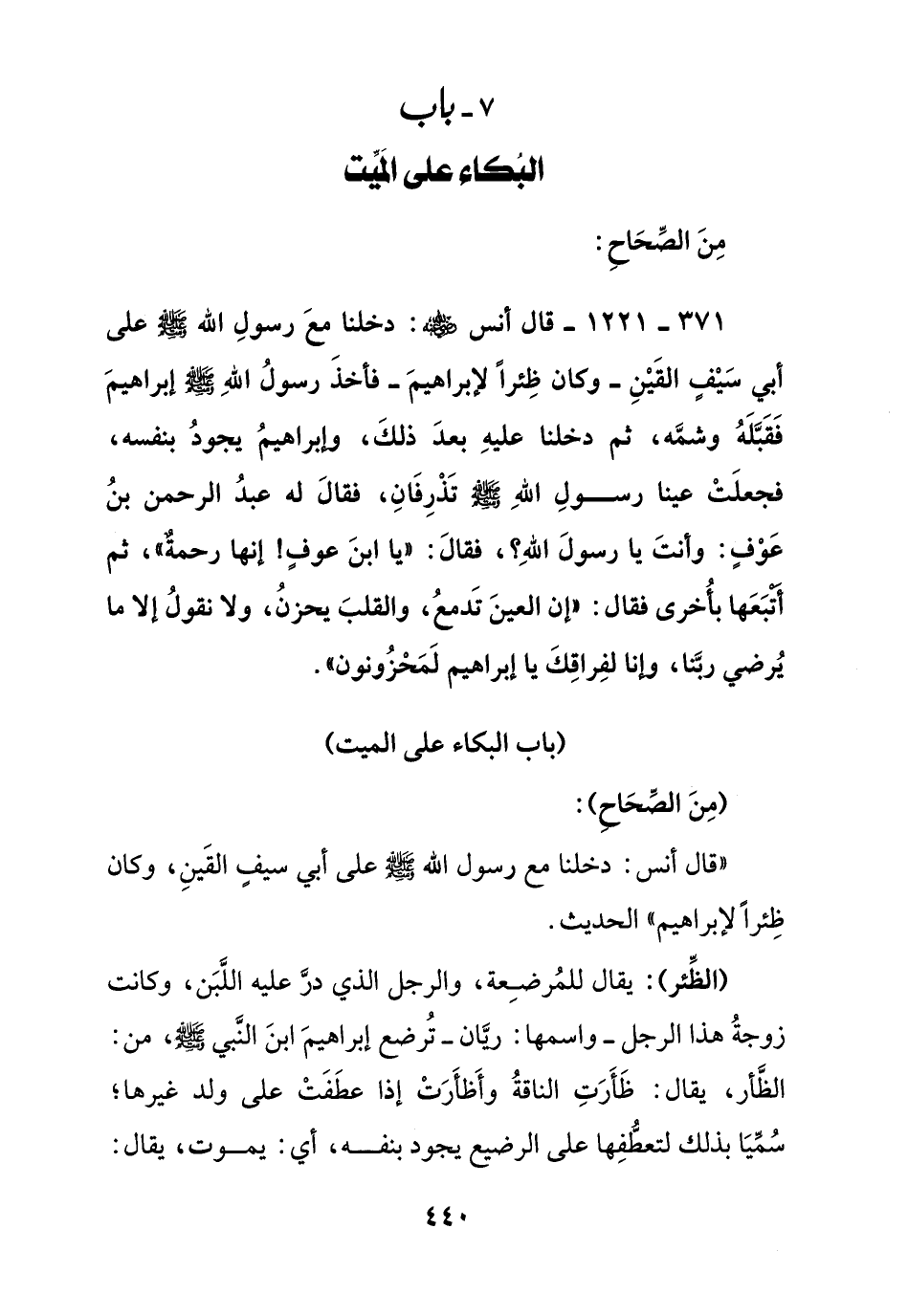 371 - 1221 - قال أنس رضي الله عنه: دخلنا مع رسول الله صلى الله عليه وسلم على أبي سيف القين - وكان ظئرا لإبراهيم - فأخذ رسول الله صلى الله عليه وسلم إبراهيم فقبله وشمه , ثم دخلنا عليه بعد ذلك , وإبراهيم يجود بنفسه , فجعلت عينا رسول الله صلى الله عليه وسلم تذرفان , فقال له عبد الرحمن بن عوف: وأنت يا رسول الله؟ فقال: " يا ابن عوف! إنها رحمة " ثم أتبعها بأخرى فقال: " إن العين تدمع , والقلب يحزن , ولا نقول إلا ما يرضي ربنا, وإنا لفراقك يا إبراهيم لمحزونون ".