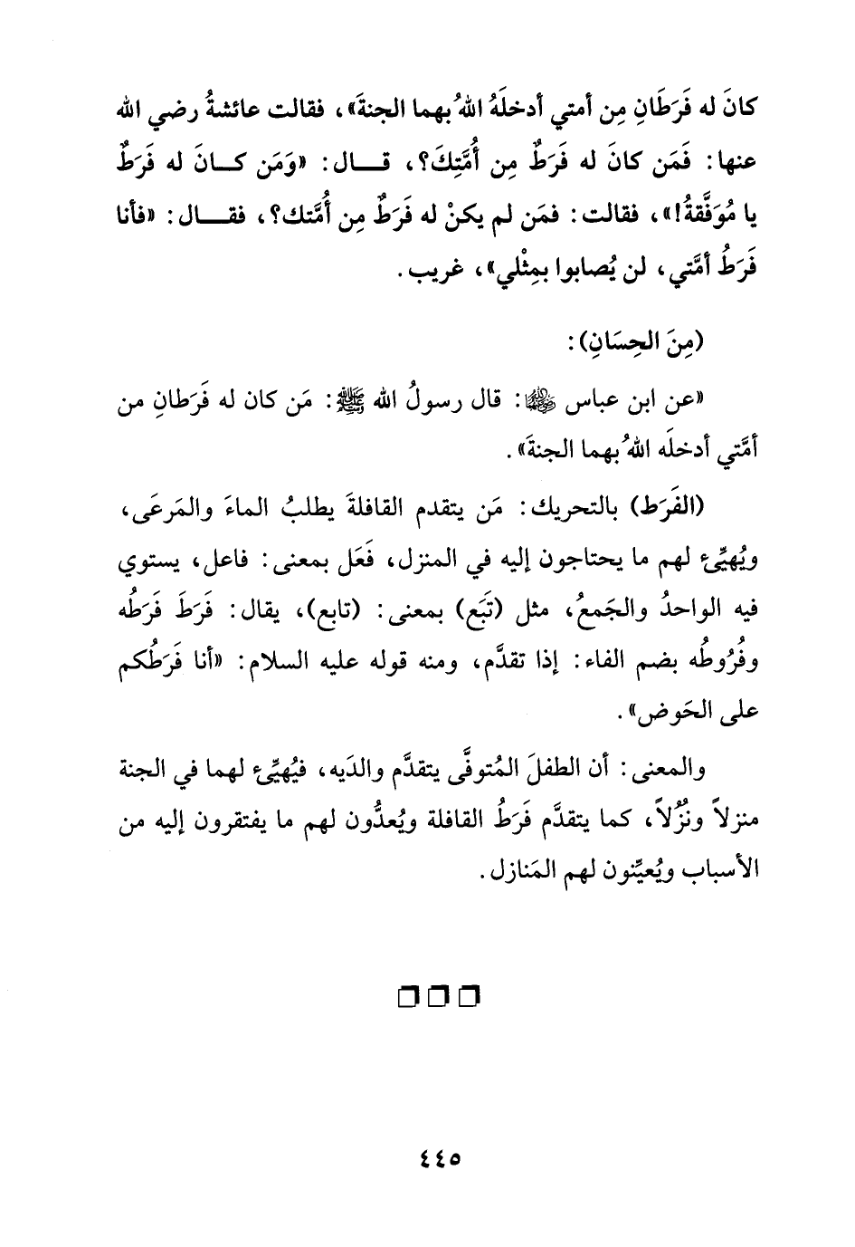 " عن ابن عباس رضي الله عنهما: قال رسول الله صلى الله عليه وسلم: من كان له فرطان من أمتي أدخله الله بهما الجنة ".