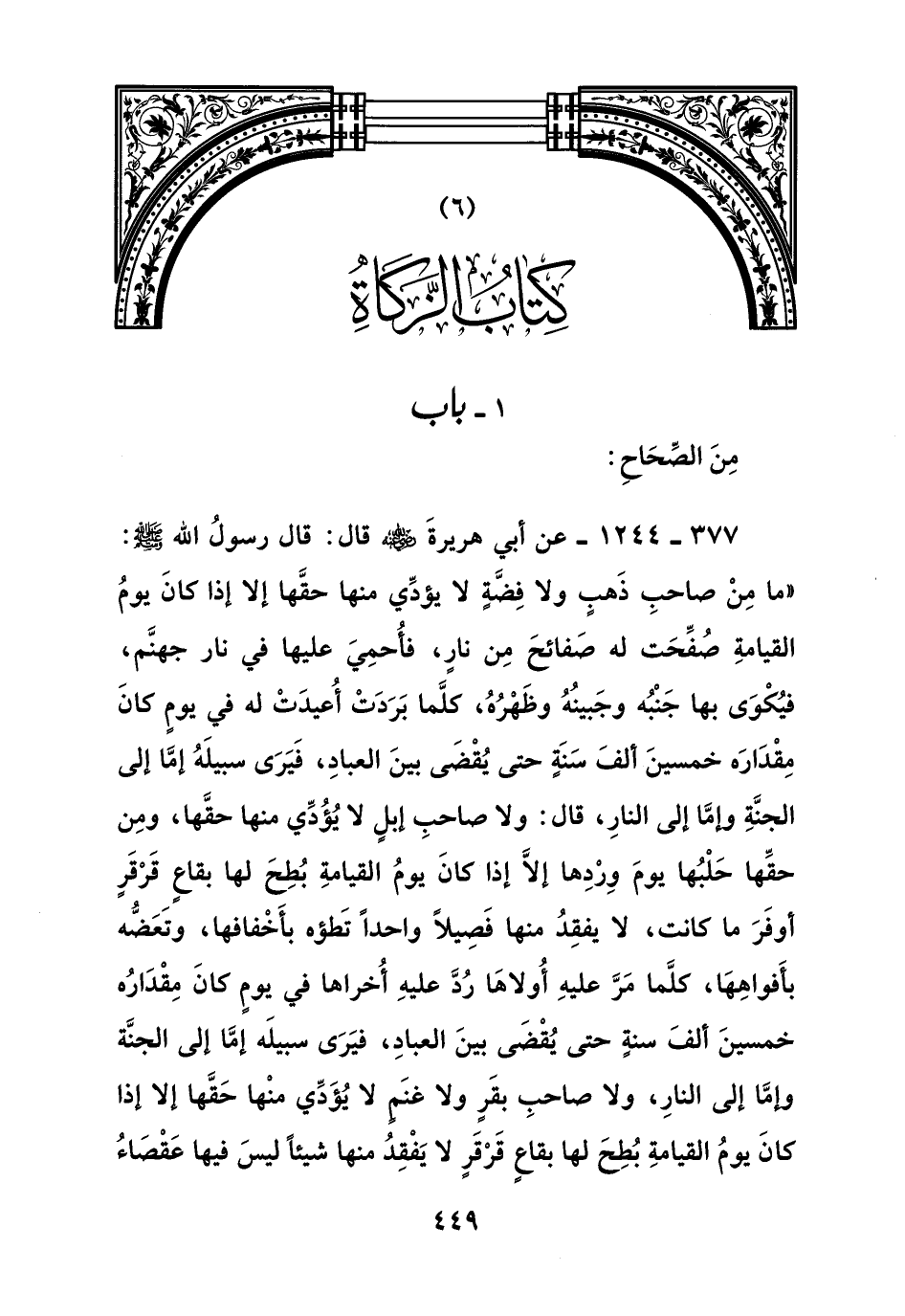 377 - 1244 - عن أبي هريرة رضي الله عنه قال: قال رسول الله صلى الله عليه وسلم: " ما من صاحب ذهب ولا فضة لا يؤدي منها حقها إلا إذا كان يوم القيامة صفحت له صفائح من نار , فأحمي عليها في نار جهنم , فيكوى بها جنبه وجبينه وظهره , كلما بردت أعيدت له في يوم كان مقداره خمسين ألف سنة حتى يقضى بين العباد , فيرى سبيله إما إلى الجنة وإما إلى النار , قال: ولا صاحب إبل لا يؤدي منها حقها , ومن حقها حلبها يوم وردها إلا إذا كان يوم القيامة بطح لها بقاع قرقر أوفر ما كانت , لا يفقد منها فصيلا واحدا تطؤه بأخفافها , وتعضه بأفواهها , كلما مر عليه أولاها رد عليه أخراها في يوم كان مقداره خمسين ألف سنة حتى يقضى بين العباد , فيرى سبيله إما إلى الجنة وإما إلى النار , ولا صاحب بقر ولا غنم لا يؤدي منها حقها إلا إذا كان يوم القيامة بطح لها بقاع قرقر لا يفقد منها شيئا ليس فيها عقصاء