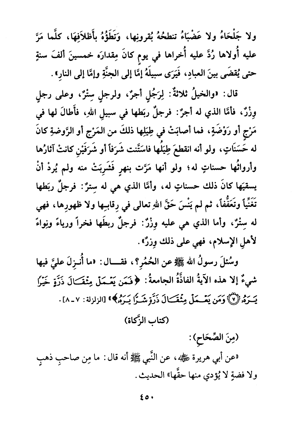 وسئل رسول الله صلى الله عليه وسلم عن الحمر؟ فقال: " ما أنزل على فيها شيء إلا هذه الآية الفاذة الجامعة: {فمن يعمل مثقال ذرة خيرا يره * ومن يعمل مثقال ذرة شرا يره} [الزلزلة:7 - 8].