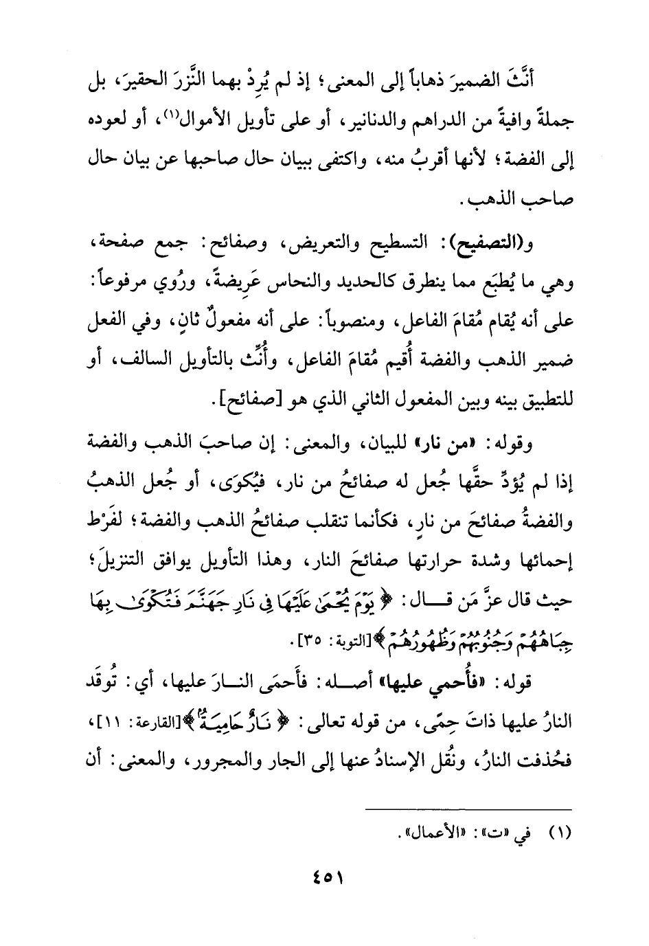 و (التصفيح): التسطيح والتعريض , وصفائح: جمع صفحة , وهي ما يطبع مما ينطرق كالحديد والنحاس عريضة , وروي مرفوعا: على أنه يقام مقام الفاعل , ومنصوبا: على أنه مفعول ثان , وفي الفعل ضمير الذهب والفضة أقيم مقام الفاعل , وأنث بالتأويل السالف , أو للتطبيق بينه وبين المفعول الثاني الذي هو [صفائح].