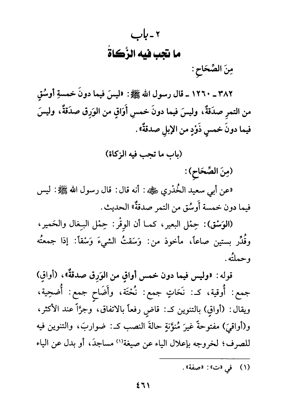 قوله: " وليس فيما دون خمس أواق من الورق صدقة " , (أواق) جمع: أوقية , كـ: نحات جمع: نحتة , وأضاح جمع: أضحية , ويقال: (أواق) بالتنوين كـ: قاض رفعا بالاتفاق , وجرا عند الأكثر , و (أواقي) مفتوحة غير منونة حالة النصب كـ: ضوارب , والتنوين فيه للصرف , لخروجه بإعلال الياء عن صيغة مساجد , أو بدل عن الياء