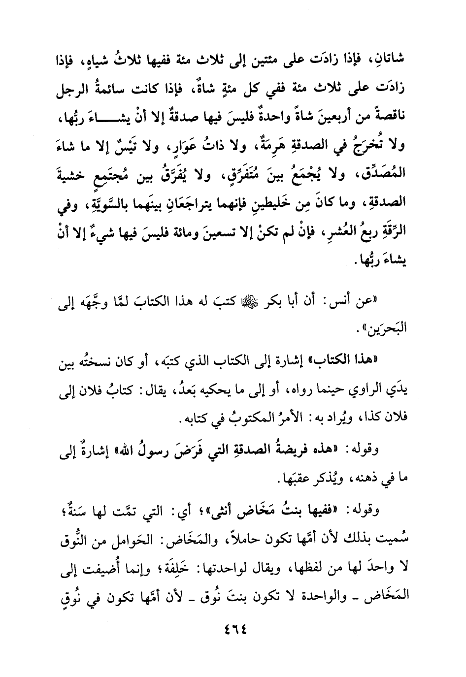 شاتان , فإذا زادت على مئتين إلى ثلاث مئة ففيها ثلاث شياه , فإذا زادت على ثلاث مئة ففي كل مئة شاة , فإذا كانت سائمة الرجل ناقصة من أربعين شاة واحدة فليس فيها صدقة إلا أن يشاء ربها , ولا تخرج في الصدقة هرمة , ولا ذات عوار , ولا تيس إلا ما شاء المصدق , ولا يجمع بين متفرق , ولا يفرق بين مجتمع خشية الصدقة , وما كان من خليطين فإنهما يتراجعان بينهما بالسوية , وفي الرقة ربع العشر , فإن لم تكن إلا تسعين ومائة فليس فيها شيء إلا أن يشاء ربها.