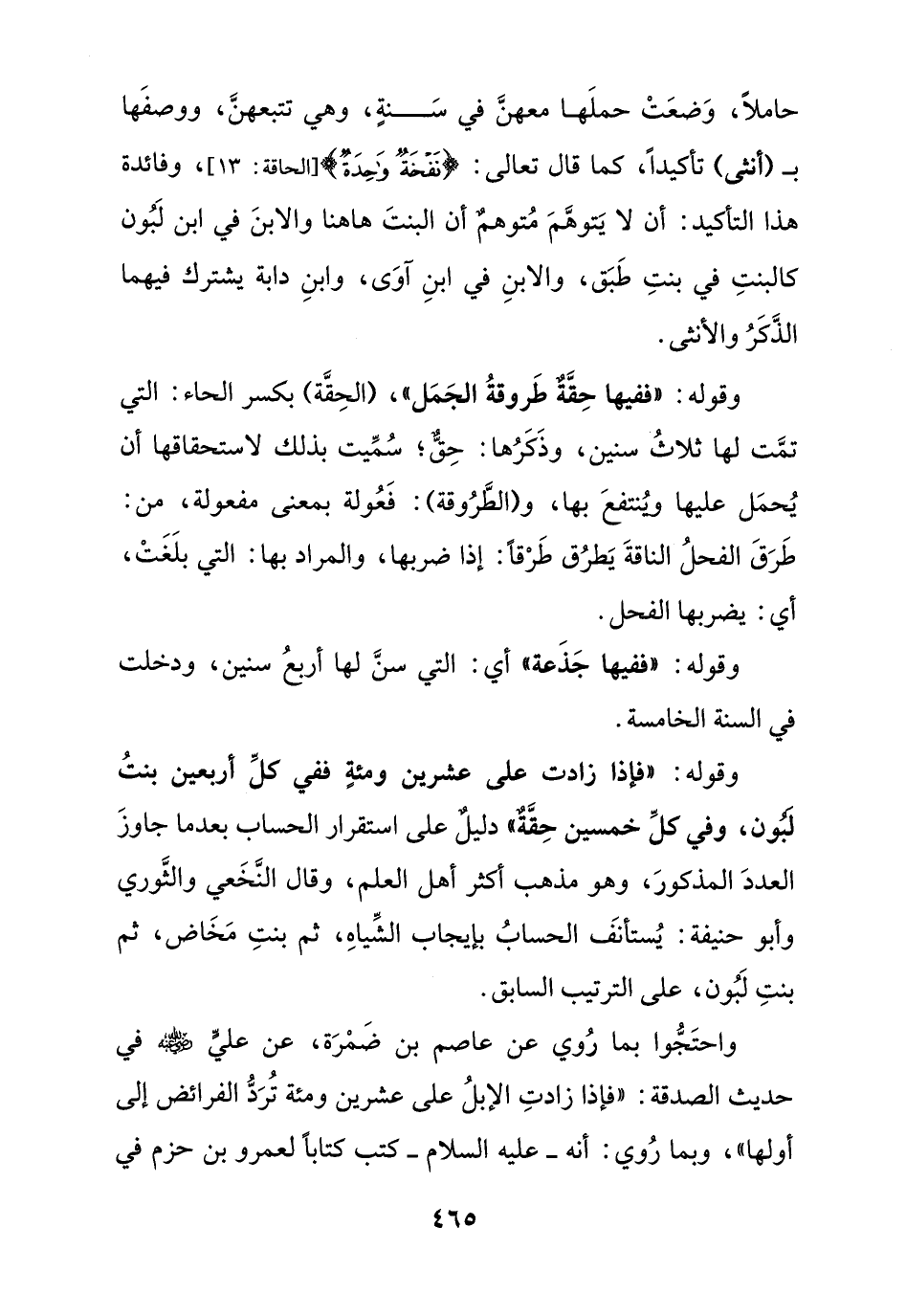 وقوله: " ففيها حقة طروقة الجمل " , (الحقة) بكسر الحاء: التي تمت لها ثلاث سنين , وذكرهما: حق , سميت بذلك لاستحقاقها أن يحمل عليها وينتفع بها , و (الطروقة): فعولة بمعنى مفعولة , من: طرق الفحل الناقة يطرق طرقا: إذا ضربها , والمراد بها: التي بلغت , أي: يضربها الفحل.