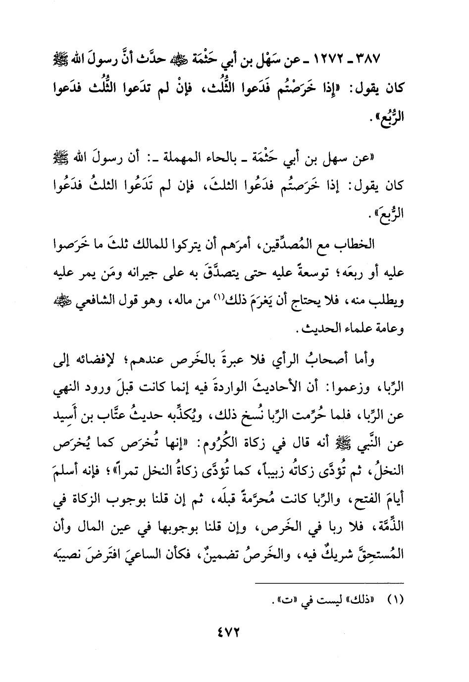 387 – 1272 – عن سهل بن أبي حثمة رضي الله عنه حدث أن رسول الله صلى الله عليه وسلم كان يقول: " إذا خرصتم فدعوا الثلث , فإن لم تدعوا الثلث فدعوا الربع ".