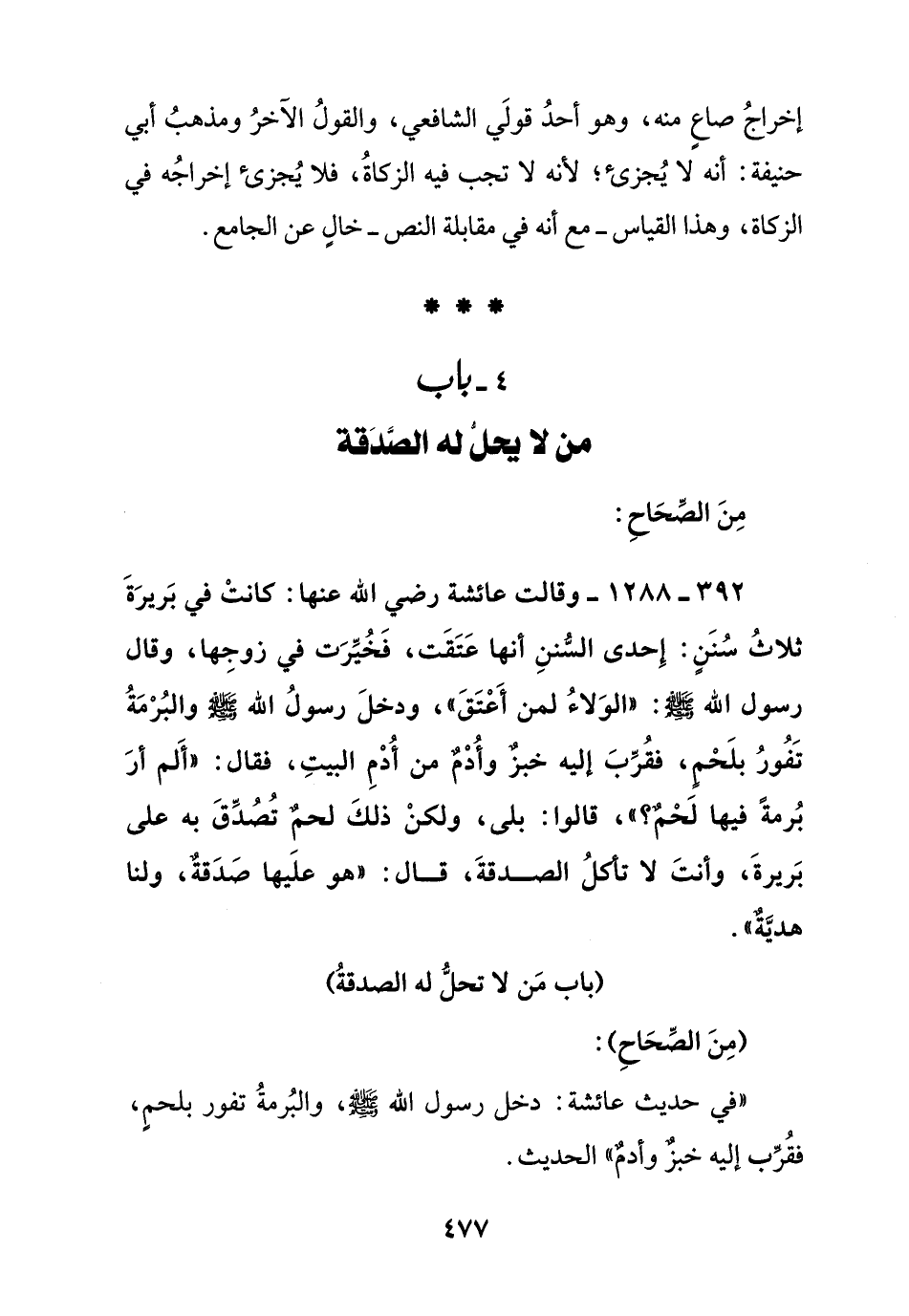 392 - 1288 - وقالت عائشة رضي الله عنها: كانت في بريرة ثلاث سنن: إحدى السنن أنها عتقت , فخيرت في زوجها , وقال رسول الله صلى الله عليه وسلم: " الولاء لمن أعتق " ودخل رسول الله صلى الله عليه وسلم والبرمة تفور بلحم , فقرب إليه خبز وأدم من أدم البيت , فقال: " ألم أر برمة فيها لحم؟ ", قالوا: بلى , ولكن ذلك لحم تصدق به على بريرة , وأنت لا تأكل الصدقة , قال: " هو عليها صدقة , ولنا هدية ".