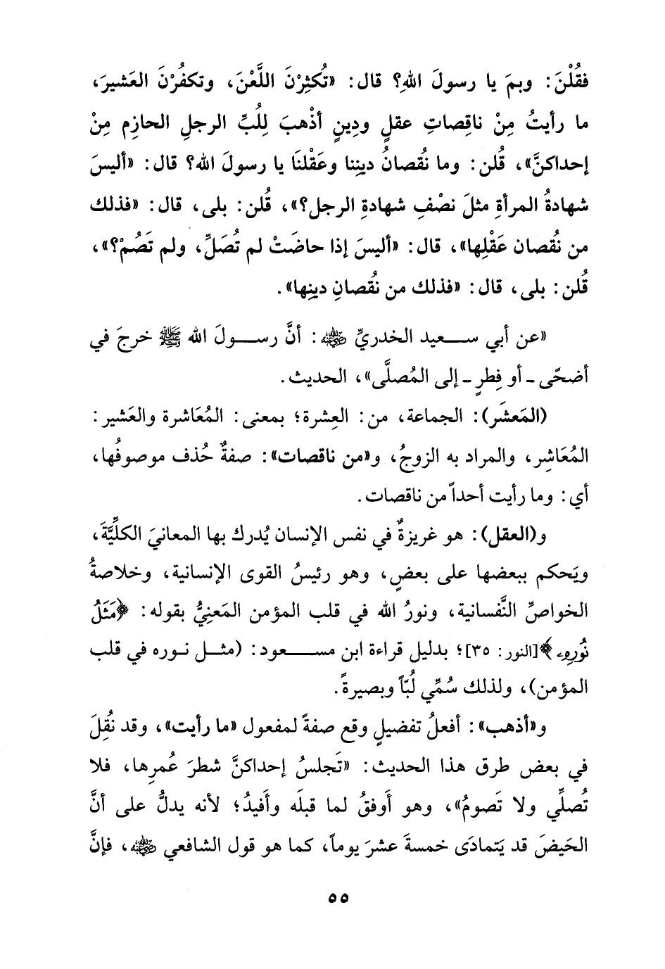 فقلن: وبم يا رسول الله؟ قال: تكثرن اللعن, وتكفرن العشير, ما رأيت من ناقصات عقل ودين أذهب للب الرجل الحازم من إحداكن ", قلن: وما نقصان