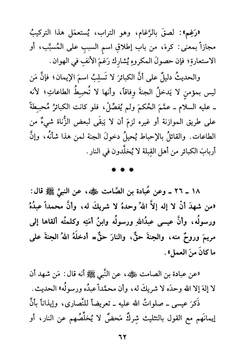 18 – 26 – وعن عبادة بن الصامت - رضي الله عنه - ,عن النبي - صلى الله عليه وسلم - قال: من شهد أن لا إله