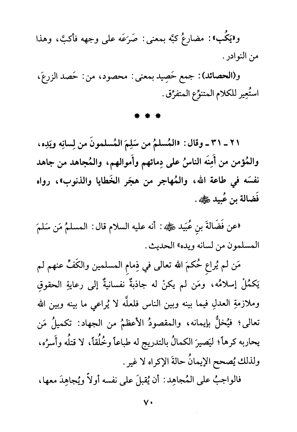 21 – 31 – وقال:" المسلم من سلم المسلمون من لسانه ويده, والمؤمن من أمنه