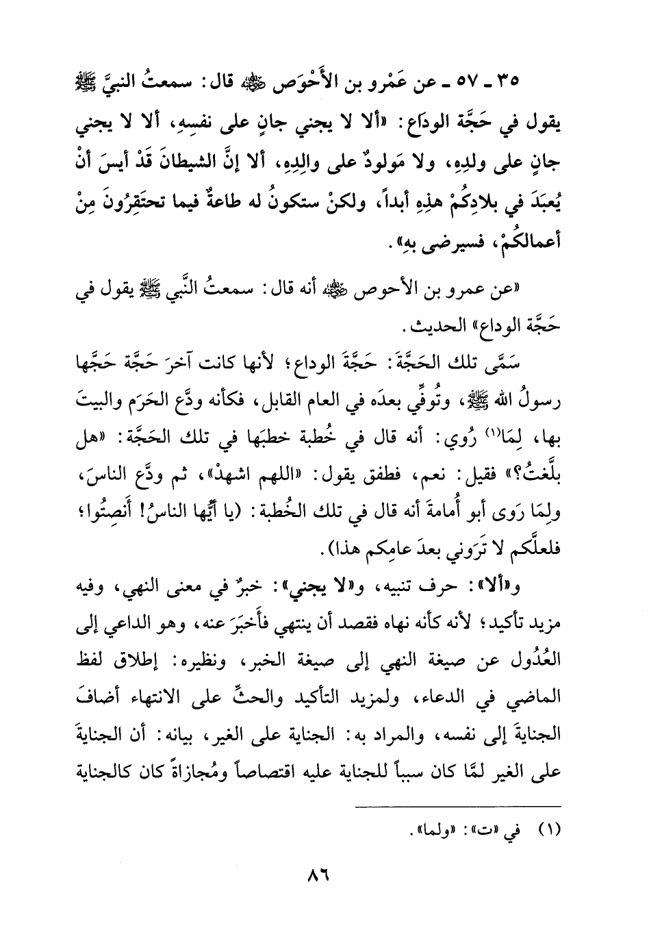 35 – 57 – عن عمرو بن الأحوص - رضي الله عنه - قال: سمعت النبي - صلى الله عليه وسلم - يقول في حجة الوداع:"