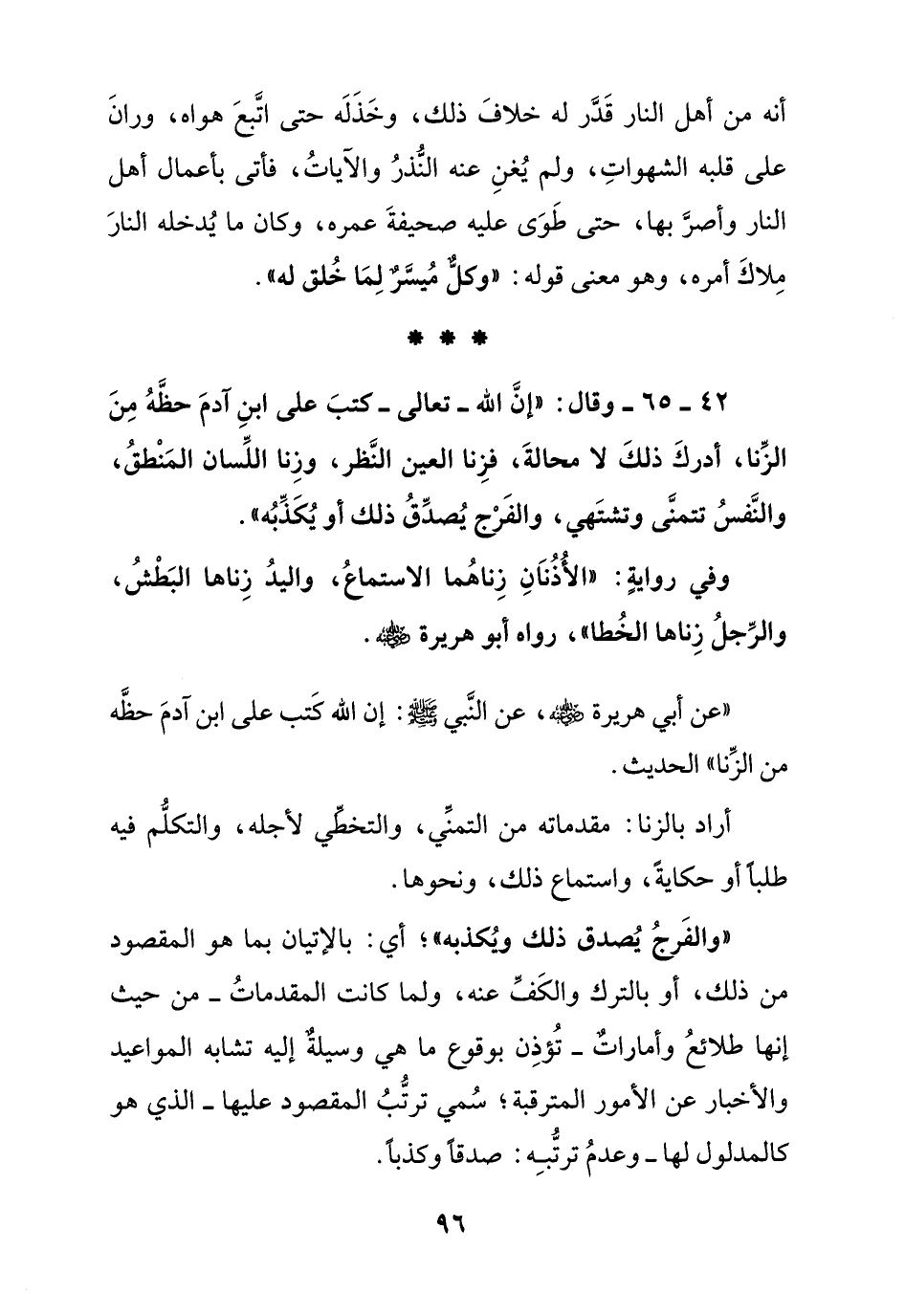42 – 65 – وقال: " إن الله تعالى – كتب على ابن آدم حظه من الزنا, أدرك ذلك لا محالة, فزنا العين النظر, وزنا اللسان المنطق, والنفس تتمنى وتشتهي, والفرج يصدق ذلك أو يكذبه "