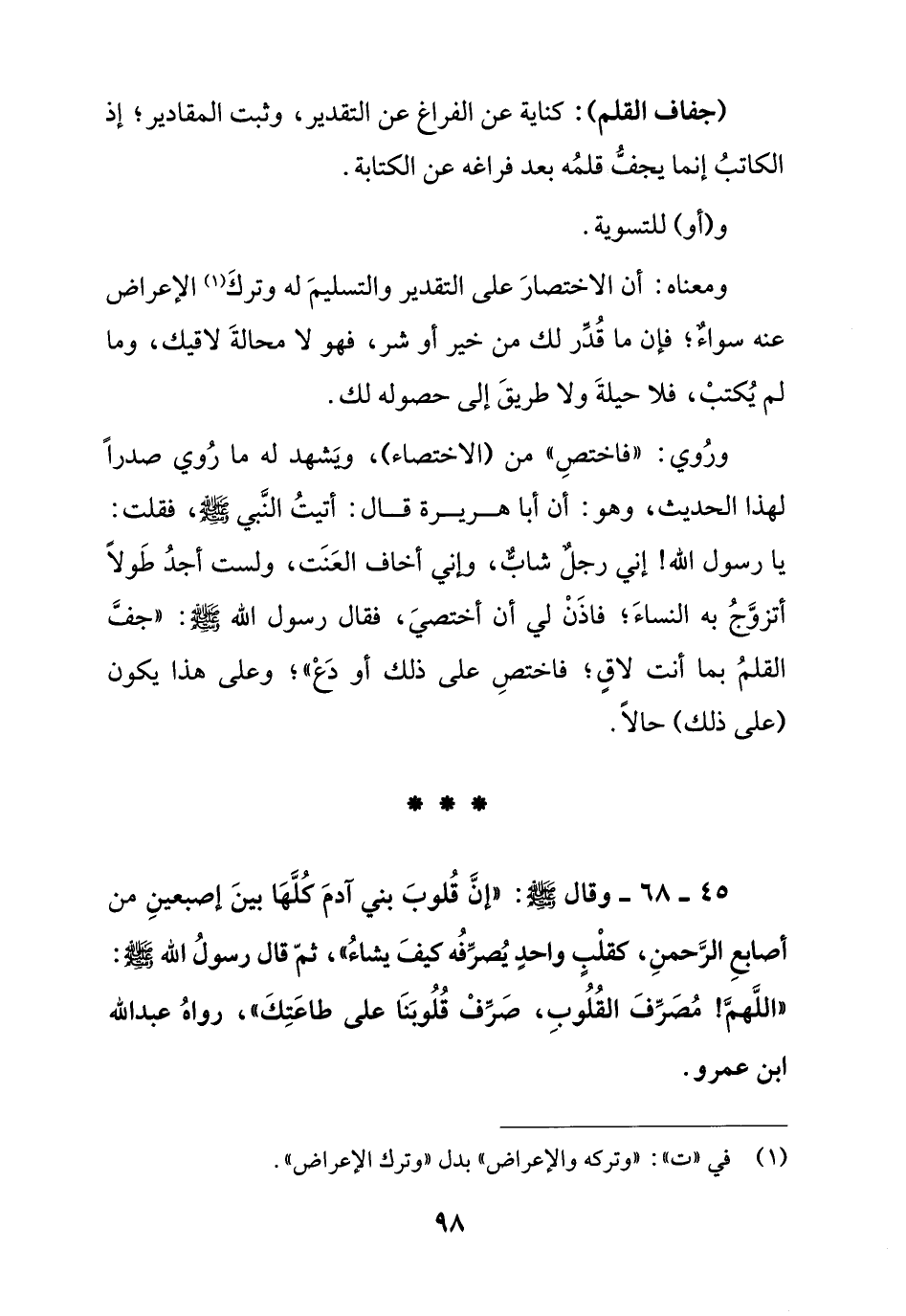 45 – 68 – وقال - صلى الله عليه وسلم -: " إن قلوب بني آدم كلها بين إصبعين من أصابع الرحمن, كقلب واحد يصرفه كيف يشاء ", ثم قال رسول الله - صلى الله عليه وسلم -: "اللهم مصرف القلوب, صرف قلوبنا على طاعتك ", رواه عبد الله ابن عمرو