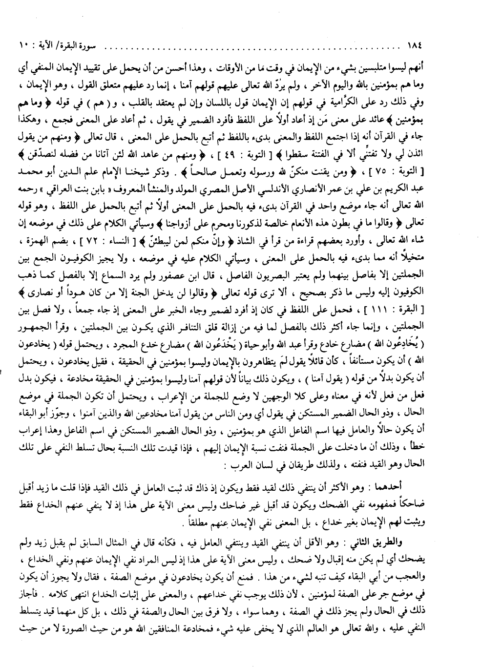 ليسوا متلبسين بشيء من الإيمان في وقت مّا من الأوقات ، وهذا أحسن من أن يحمل على تقييد الإيمان المنفي ، أي وما هم بمؤمنين بالله واليوم الآخر ، ولم يردّ الله تعالى عليهم قولهم : آمنا ، إنما رد عليهم متعلق القول وهو الإيمان ، وفي ذلك رد على الكرامية في قولهم : إن الإيمان قول باللسان وإن لم يعتقد بالقلب . وهم في قوله : ) وَمَا هُم بِمُؤْمِنِينَ ( عائد على معنى من ، إذ أعاد أولاً على اللفظ فأفرد الضمير في يقول ، ثم أعاد على المعنى فجمع . وهكذا جاء في القرآن أنه إذا اجتمع اللفظ والمعنى بدىء باللفظ ثم أتبع بالحمل على المعنى . قال تعالى : ) وَمِنْهُمْ مَّن يَقُولُ ائْذَن لّي وَلاَ تَفْتِنّى أَلا فِى الْفِتْنَةِ سَقَطُواْ ( ، ( وَمِنْهُمْ مَّنْ عَاهَدَ اللَّهَ لَئِنْ ءاتَانَا مِن فَضْلِهِ لَنَصَّدَّقَنَّ ( الآية ، ( وَمَن يَقْنُتْ مِنكُنَّ للَّهِ وَرَسُولِهِ وَتَعْمَلْ صَالِحاً ).