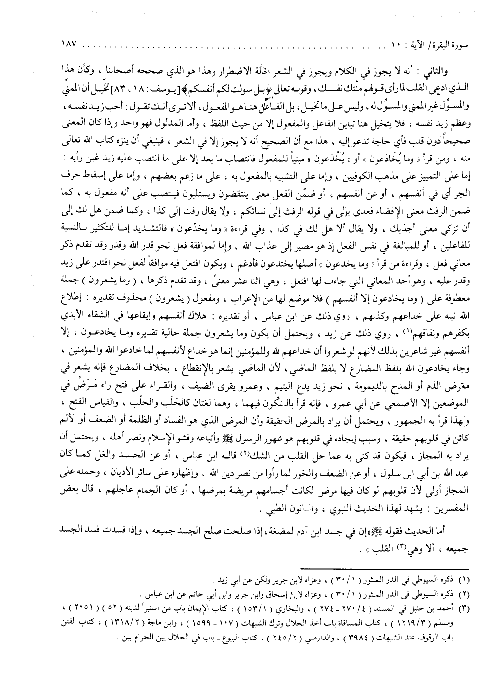 والقراء على فتح راء مرض في الموضعين إلا الأصمعي ، عن أبي عمرو ، فإنه قرأ بالسكون فيهما ، وهما لغتان كالحلب والحلب ، والقياس الفتح ، ولهذا قرأ به الجمهور ، ويحتمل أن يراد بالمرض الحقيقة ، وأن المرض الذي هو الفساد أو الظلمة أو الضعف أو الألم كائن في قلوبهم حقيقة ، وسبب إيجاده في قلوبهم هو ظهور الرسول ( صلى الله عليه وسلم ) ) وأتباعه ، وفشو الإسلام ونصر أهله . ويحتمل أن يراد به المجاز ، فيكون قد كنى به عما حل القلب من الشك ، قاله ابن عباس ، أو عن الحسد والغل ، كما كان عبد الله بن أبي بن سلول ، أو عن الضعف والخور لما رأوا من نصر دين الله وإظهاره على سائر الأديان ، وحمله على المجاز أولى لأن قلوبهم لو كان فيها مرض لكانت أجسامهم مريضة بمرضها ، أو كان الحمام عاجلهم ، قال : بعض المفسرين يشهد لهذا الحديث النبوي والقانون الطبي ، أما الحديث ، فقوله ( صلى الله عليه وسلم ) ) : ( إن في جسد ابن آدم لمضغة إذا صلحت صلح الجسد جميعه ، وإذا فسدت فسد الجسد جميعه ، ألا وهي القلب ) .