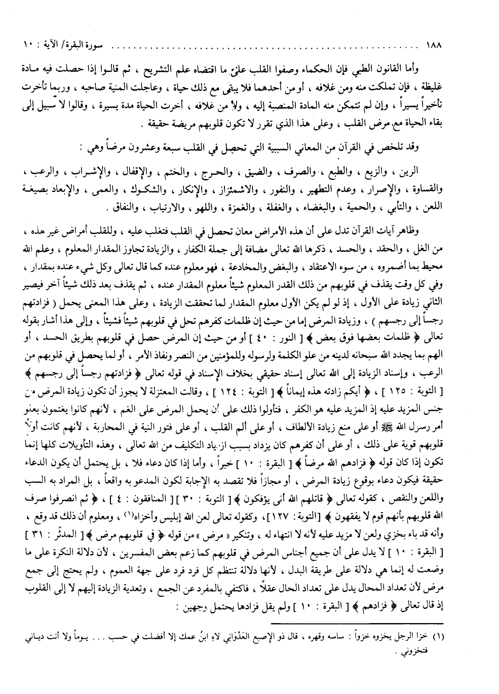 وأما القانون الطبي ، فإن الحكماء وصفو القلب على ما اقتضاه علم التشريح ، ثم قالوا : إذا حصلت فيه مادة غليظة ، فإن تملكت منه ومن غلافه أو من أحدهما فلا يبقى مع ذلك حياة وعاجلت المنية صاحبه ، وربما تأخرت تأخيراً يسيراً ، وإن لم تتمكن منه المادة المنصبة إليه ولا من غلافه ، أخرت الحياة مدة يسيرة ؟ وقالوا : لا سبيل إلى بقاء الحياة مع مرض القلب ، وعلى هذا الذي تقرر لا تكون قلوبهم مريضة حقيقة . وقد تلخص في القرآن من المعاني السببية التي تحصل في القلب سبعة وعشرون مرضاً ، وهي : الرين ، والزيع ، والطبع ، والصرف ، والضيق ، والحرج ، والختم ، والإقفال ، والإشراب ، والرعب ، والقساوة ، والإصرار ، وعدم التطهير ، والنفور ، والاشمئزاز ، والإنكار ، والشكوك ، والعمى ، والإبعاد بصيغة اللعن ، والتأبى ، والحمية ، والبغضاء ، والغفلة ، والغمزة ، واللهو ، والارتياب ، والنفاق . وظاهر آيات القرآن تدل على أن هذه الأمراض معان تحصل في القلب فتغلب عليه ، وللقلب أمراض غير هذه من الغل والحقد والحسد ، ذكرها الله تعالى مضافة إلى جملة الكفار . والزيادة تجاوز المقدار المعلوم ، وعلم الله محيط بما أضمروه ومن سوء الإعتقاد والبغض والمخادعة ، فهو معلوم عنده ، كما قال تعالى : ) وَكُلُّ شَىْء عِندَهُ بِمِقْدَارٍ ( ، وفي كل وقت يقذف في قلوبهم من ذلك القدر المعلوم شيئاً معلوم المقدار عنده ، ثم يقذف بعد ذلك شيئاً آخر ، فيصير الثاني زيادة على الأول ، إذا لو لم يكن الأول معلوم المقدار لما تحققت الزيادة ، وعلى هذا المعنى يحمل : ) فَزَادَتْهُمْ رِجْسًا إِلَى رِجْسِهِمْ ). وزيادة المرض إما من حيث أن ظلمات كفرهم تحل في قلوبهم شيئاً فشيئاً ، وإلى هذا أشار بقوله تعالى : ) ظُلُمَاتٌ بَعْضُهَا فَوْقَ بَعْضٍ ( ، أو من حيث أن المرض حصل في قلوبهم بطريق الحسد أو الهم ، بما يجدد الله سبحانه لدينه من علو الكلمة ولرسوله وللمؤمنين من النصر ونفاذ الأمر ، أو لما يحصل في قلوبهم من الرعب ، وإسناد الزيادة إلى الله تعالى إسناد حقيقي بخلاف الإسناد في قوله تعالى : ) فَزَادَتْهُمْ رِجْسًا إِلَى رِجْسِهِمْ أَيُّكُمْ زَادَتْهُ هَاذِهِ إِيمَاناً ).