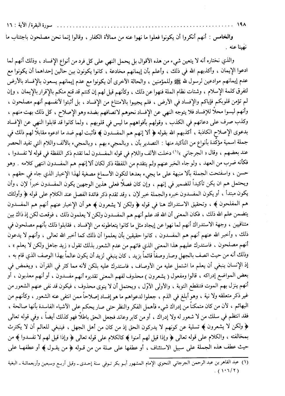 واستفتحت الجملة بألا منبهة على ما يجيء بعدها لتكون الأسماع مصغية لهذا الإخبار الذي جاء في حقهم ، ويحتمل هم أن يكون تأكيداً للضمير في أنهم وإن كان فصلاً ، فعلى هذين الوجهين يكون المفسدون خبراً لأن ، وأن يكون مبتدأ ويكون المفسدون خبره . والجملة خبر لأن ، وقد تقدم ذكر فائدة الفصل عند الكلام على قوله : ) وَأُوْلَائِكَ هُمُ الْمُفْلِحُونَ ). وتحقيق الاستدراك هنا في قوله : ) وَلَاكِن لاَّ يَشْعُرُونَ ( ، هو أن الإخبار عنهم أنهم هم المفسدون يتضمن علم الله ذلك ، فكان المعنى أن الله قد علم أنهم هم المفسدون ، ولكن لا يعلمون ذلك ، فوقعت لكن إذ ذاك بين متنافيين ، وجهة الاستدراك أنهم لما نهوا عن إيجاد مثل ما كانوا يتعاطونه من الإفساد فقابلوا ذلك بأنهم مصلحون في ذلك ، وأخبر الله عنهم أنهم هم المفسدون ، كانوا حقيقين بأن يعلموا أن ذلك كما أخبر الله تعالى ، وأنهم لا يدعون أنهم مصلحون ، فاستدرك عليهم هذا المعنى الذي فاتهم من عدم الشعور بذلك . تقول : زيد جاهل ولكن لا يعلم ، وذلك أنه من حيث اتصف بالجهل وصار وصفاً قائماً بزيد ، كان ينبغي لزيد أن يكون عالماً بهذا الوصف الذي قام به ، إذ الإنسان ينبغي أن يعلم ما اشتمل عليه من الأوصاف ، فاستدرك عليه بلكن ، لأنه مما كثر في القرآن ويغمض في بعض المواضع إدراكه . قالوا : ومفعول يشعرون محذوف لفهم المعنى تقديره أنهم مفسدون ، أو أنهم معذبون ، أو أنهم ينزل بهم الموت فتنقطع التوبة ، والأولى ، ويحتمل أن لا ينوي محذوف فيكون قد نفى عنهم الشعور من غير ذكر متعلقه ولا نية ، وهو أبلغ في الذم ، جعلوا لدعواهم ما هو إفساد إصلاحاً ممن انتفى عنه الشعور وكأنهم من البهائم ، لأن من كان متمكناً من إدراك شيء فأهمل الفكر والنظر حتى صار يحكم على الأشياء الفاسدة بأنها صالحة ، فقد انتظم في سلك من لا شعور له ولا إدراك ، أو من كابر وعاند فجعل الحق باطلاً ، فهو كذلك أيضاً . وفي قوله تعالى : ) ولكن لا يشعرون تسلية عن كونهم لا يدركون الحق ، إذ من كان من أهل الجهل فينبغي للعالم أن لا يكترث بمخالفته .