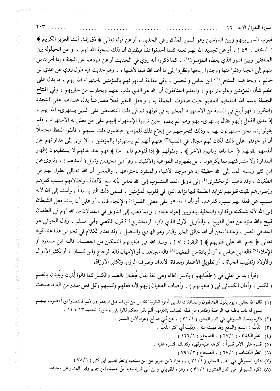 وقد تقدم الكلام في نحو من هذا عند قوله تعالى : ) خَتَمَ اللَّهُ عَلَى قُلُوبِهِمْ ( ومد الله في طغيانهم ، التمكين من العصيان ، قاله ابن مسعود ، أو الإملاء ، قاله ابن عباس ، أو الزيادة من الطغيان ، قاله مجاهد ، أو الإمهال ، قاله الزجاج وابن كيسان ، أو تكثير الأموال ، والأولاد ، وتطييب الحياة ، أو تطويل الأعمار ، ومعافاة الأبدان ، وصرف الرزايا ، وتكثير الأرزاق . وقرأ زيد بن علي : في طغيانهم بكسر الطاء ، وهي لغة ، يقال : طغيان بالضم والكسر ، كما قالوا : القيان ، وغينان ، بالضم والكسر . وأمال الكسائي في طغيانهم ، وأضاف الطغيان إليهم لأنه فعلهم وكسبهم ، وكل فعل صدر من العبد صحت