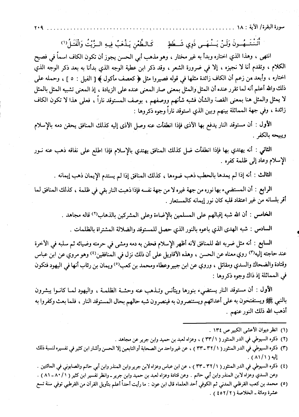 وهذا الذي اختاره ونبأ به غير مختار ، وهو مذهب أبي الحسن ، يجوز أن تكون الكاف اسماً في فصيح الكلام ، وتقدم أنا لا نجيزه إلا في ضرورة الشعر ، وقد ذكر ابن عطية الوجه الذي بدأنا به بعد ذكر الوجه الذي اختاره ، وأبعد من زعم أن الكاف زائدة مثلها في قوله : فصيروا مثل : ) كَعَصْفٍ مَّأْكُولِ ). وحمله على ذلك ، والله أعلم ، أنه لما تقرر عنده أن المثل والمثل بمعنى ، صار المعنى عنده على الزيادة ، إذ المعنى تشبيه المثل بالمثل ، لا يمثل المثل والمثل هنا بمعنى القصة والشأن ، فشبه شأنهم ووصفهم بوصف المستوقد ناراً فعلى هذا لا تكون الكاف زائدة . وفي جهة المماثلة بينهم وبين الذي استوقد ناراً وجوه ذكروها : الأول : أن مستوقد النار يدفع بها الأذى ، فإذا انطفأت عنه وصل الأذى إليه ، كذلك المنافق يحقن دمه بالإسلام ويبيحه بالكفر . الثاني : أنه يهتدي بها ، فإذا انطفأت ضل ، كذلك المنافق يهتدي بالإسلام ، فإذا اطلع على نفاقه ذهب عنه نور الإسلام وعاد إلى ظلمه كفرة . الثالث : أنه إذا لم يمدها بالحطب ذهب ضوؤها ، كذلك المنافق ، إذا لم يستدم الإيمان ذهب إيمانه . الرابع : أن المستضيء بها نوره من جهة غيره لا من جهة نفسه ، فإذا ذهبت النار بقي في ظلمة ، كذلك المنافق لما أقر بلسانه من غير اعتقاد قلبه كان نور إيمانه كالمستعار . الخامس : أن الله شبه إقبالهم على المسلمين بالإضاءة وعلى المشركين الذهاب ، قاله مجاهد : السادس : شبه الهدى الذي باعوه بالنور الذي حصل للمستوقد ، والضلالة المشتراة بالظلمات . السابع : أنه مثل ضربه الله للمنافق لأنه أظهر الإسلام فحقن به دمه ومشى في حرمته وضيائه ثم سلبه في الآخرة عند حاجته إليه ، روي معناه عن الحسن ، وهذه الأقاويل على أن ذلك نزل في المنافقين ، وهو مروي عن ابن عباس ، وقتادة ، والضحاك ، والسدي ، ومقاتل .