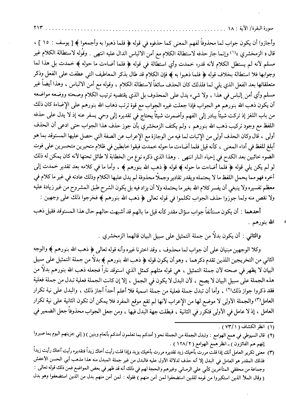 ولم يكتف الزمخشري بأن جوز حذف هذا الجواب حتى ادعى أن الحذف أولى ، قال : وكان الحذف أولى من الإثبات ، لما فيه من الوجازة مع الإعراب عن الصفة التي حصل عليها المستوقد بما هو أبلغ للفظ في أداء المعنى ، كأنه قيل : فلما أضاءت ما حوله خمدت ، فبقوا خابطين في ظلام ، متحيرين متحسرين على فوت الضوء ، خائبين بعد الكدح في إحياء النار ، انتهى . وهذا الذي ذكره نوع من الخطابة لا طائل تحتها ، لأنه يمكن له ذلك لو لم يكن يلي قوله : ) فَلَمَّا أَضَاءتْ مَا حَوْلَهُ ( ، قوله : ) ذَهَبَ اللَّهُ بِنُورِهِمْ ). وأما ما في كلامه بعد تقدير خمدت إلى آخره ، فهو مما يحمل اللفظ ما لا يحتمله ، ويقدر تقادير وجملاً محذوفة لم يدل عليها الكلام ، وذلك عادته في غير ما كلام في معظم تفسيره ، ولا ينبغي أن يفسر كلام الله بغير ما يحتمله ، ولا أن يزاد فيه ، بل يكون الشرح طبق المشروح من غير زيادة عليه ولا نقص منه . ولما جوز واحذف الجواب تكلموا في قوله تعالى : ) ذَهَبَ اللَّهُ بِنُورِهِمْ ( ، فخرجوا ذلك على وجهين : أحدهما : أن يكون مستأنفاً جواب سؤال مقدر كأنه قيل : ما بالهم قد أشبهت حالهم حال هذا المستوقد ؟ فقيل : ذهب الله بنورهم . والثاني : أن يكون بدلاً من جملة التمثيل على سبيل البيان ، قالهما الزمخشري ، وكلا الوجهين مبنيان على أن جواب لما محذوف ، وقد اخترنا غيره وأنه قوله تعالى : ) ذَهَبَ اللَّهُ بِنُورِهِمْ ( والوجه الثاني من التخريجين اللذين تقدم ذكرهما ، وهو أن يكون قوله : ) ذَهَبَ اللَّهُ بِنُورِهِمْ ( بدلاً من جملة التمثيل ، على سبيل البيان ، لا يظهر في صحته ، لأن جملة التمثيل هي قوله : ) مَثَلُهُمْ كَمَثَلِ الَّذِى اسْتَوْقَدَ نَاراً فَجَعَلَهُ ذَهَبَ اللَّهُ بِنُورِهِمْ ( بدلاً من هذه الجملة ، على سبيل البيان ، لا يصح ، لأن البدل لا يكون في الجمل إلا إن كانت الجملة فعلية تبدل من جملة فعلية ، فقد ذكروا جواز ذلك . أما أن تبدل جملة فعلية من جملة إسمية فلا أعلم أحداً أجاز ذلك ، والبدل على نية تكرار العامل . والجملة الأولى لا موضع لها من الإعراب لأنها لم تقع موقع المفرد ، فلا يمكن أن تكون الثانية على نية تكرار العامل ، إذ لا عامل في الأولى فتكرر في الثانية فبطلت جهة البدل فيها ، ومن جعل الجواب محذوفاً جعل الضمير في